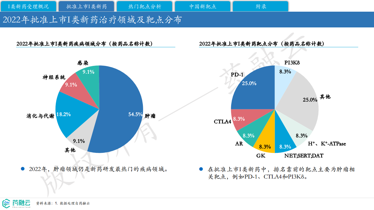 尽管数量下降,肿瘤领域仍是2022年新药研发最热门的疾病领域。在批准上市的I类新药中,排名靠前的靶点主要为肿瘤相关靶点,例如PD-1、CTLA4和PI3Kδ。