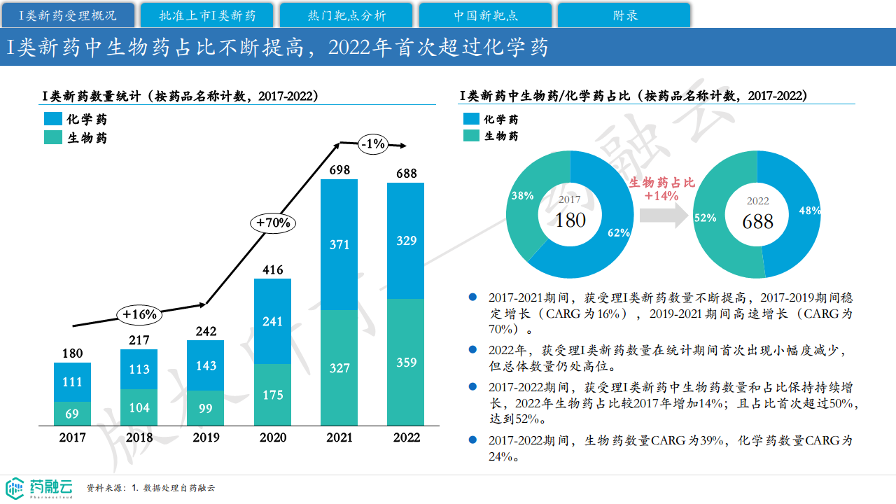 同时,I类新药中生物药占比不断提高。2017-2022年,获受理I类新药数量不断提高,2017-2019年期间稳定增长(CARG为16%),2019-2021年期间高速增长(CARG为70%)。2022年,获受理I类新药数量首次出现小幅度减少,但总体数量仍处高位。生物药数量和占比持续增长,2022年生物药占比首次超过50%,达到52%,较2017年增加14%;生物药数量CARG为39%,化学药数量CARG为24%。