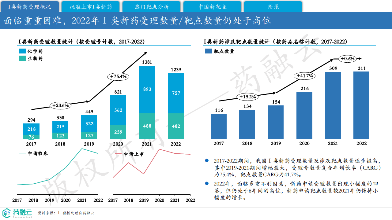本报告基于摩熵医药数据库截至2022年11月30日的统计数据,对2017-2022年中国I类新药(不含中药和原料药)的受理和批准上市情况进行了分析。报告核心观点如下: