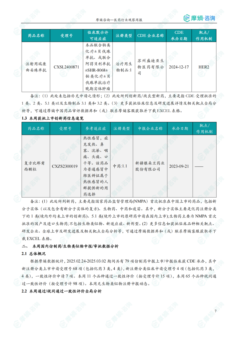 本报告基于摩熵咨询2025年3月2日发布的医药行业观察周报数据,对2025年2月24日至3月2日期间中国及全球医药市场创新药、仿制药及相关政策法规进行统计分析,核心观点如下: