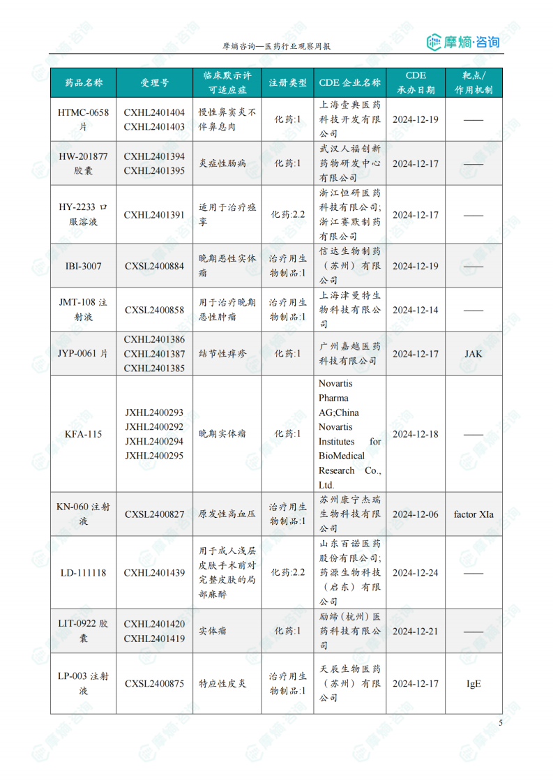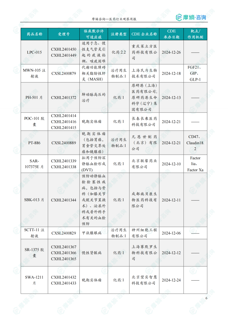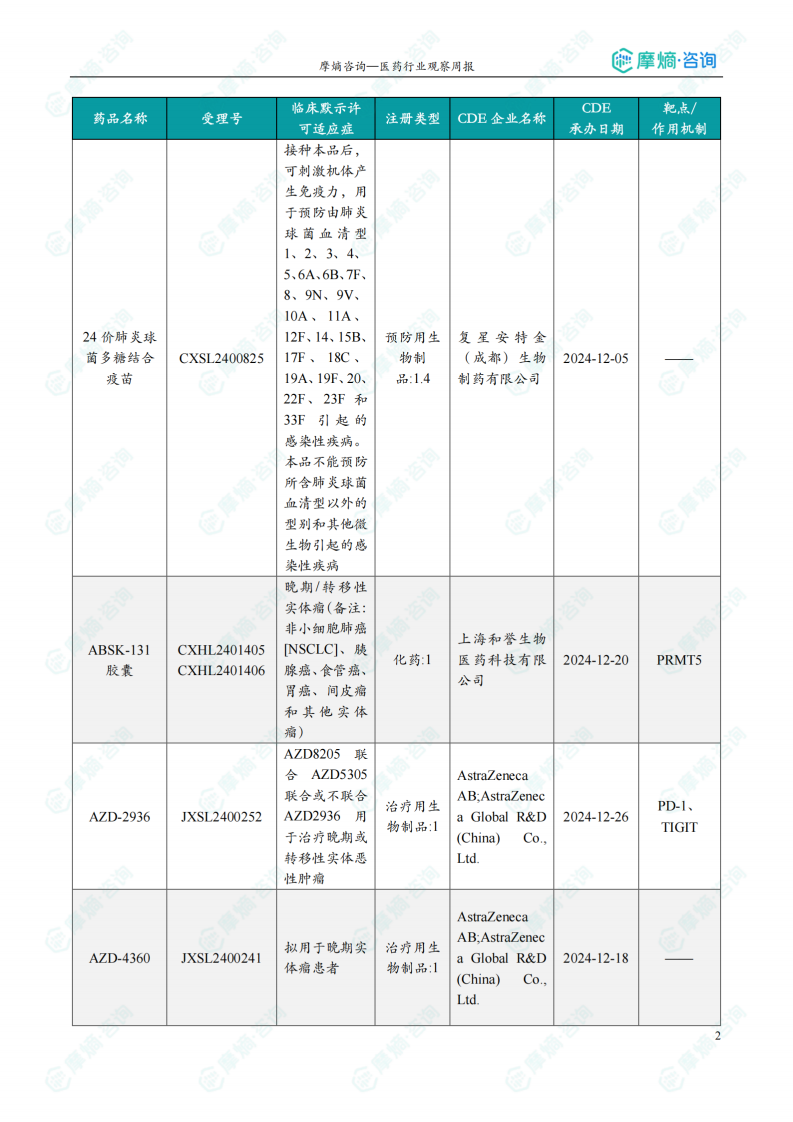 本节详细列出了本周获得临床默示许可的创新药/改良型新药信息,包括药品名称、受理号、注册类型、CDE企业名称、适应症、承办日期及作用机制等。数据显示,获批临床的创新药涵盖多个治疗领域,部分品种靶向新兴靶点,例如针对PSMA的放射性配体疗法[225Ac]Ac特昔维匹肽注射液、抗TSLP单克隆抗体AZD-8630以及新型小分子PRMT5-MTA协同抑制剂ABSK-131胶囊等。