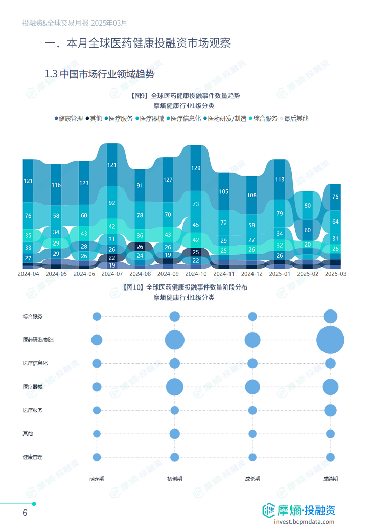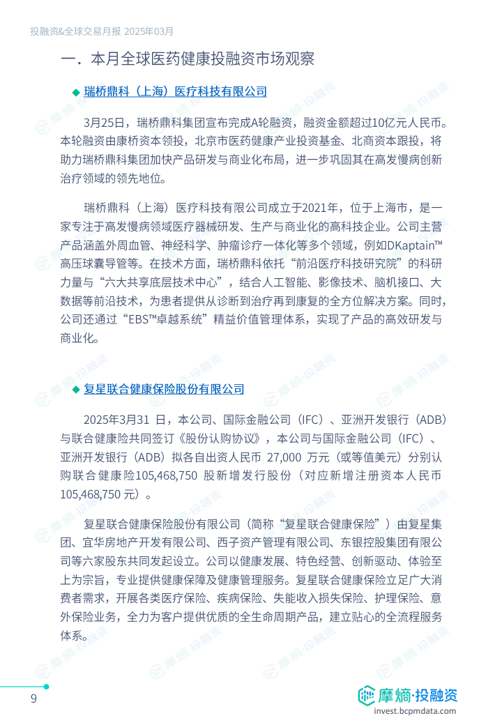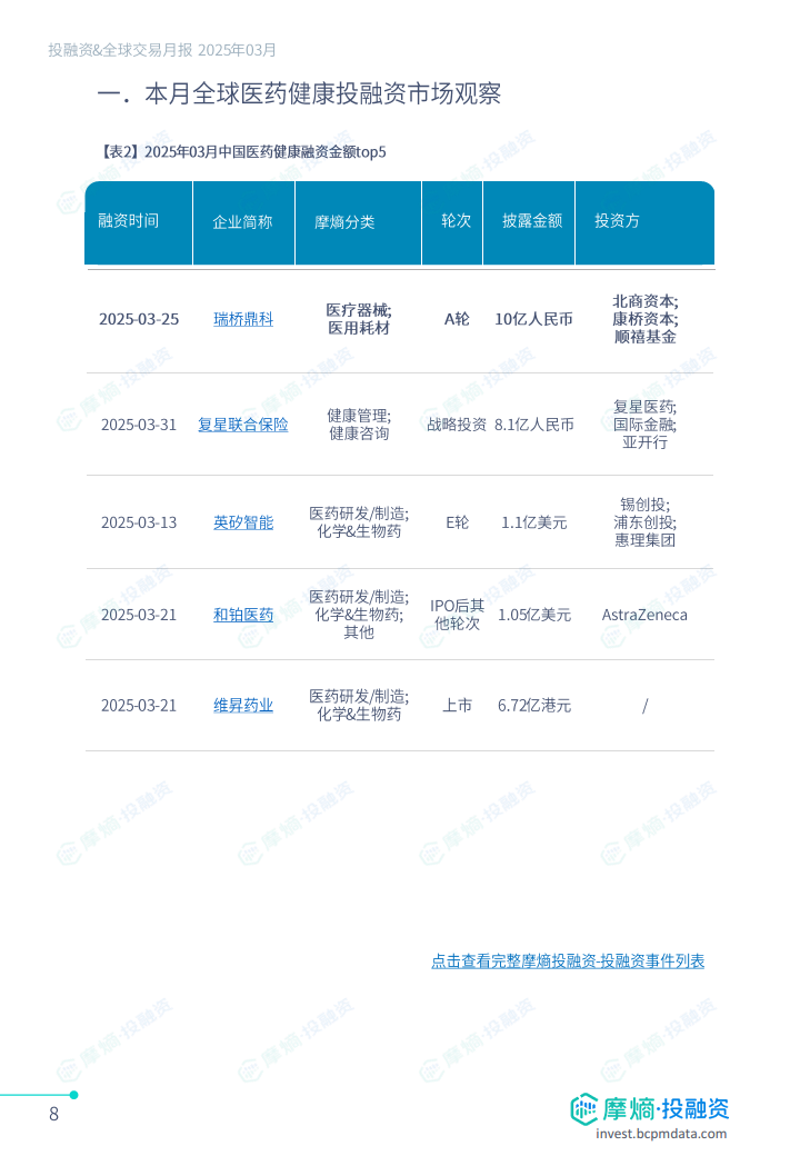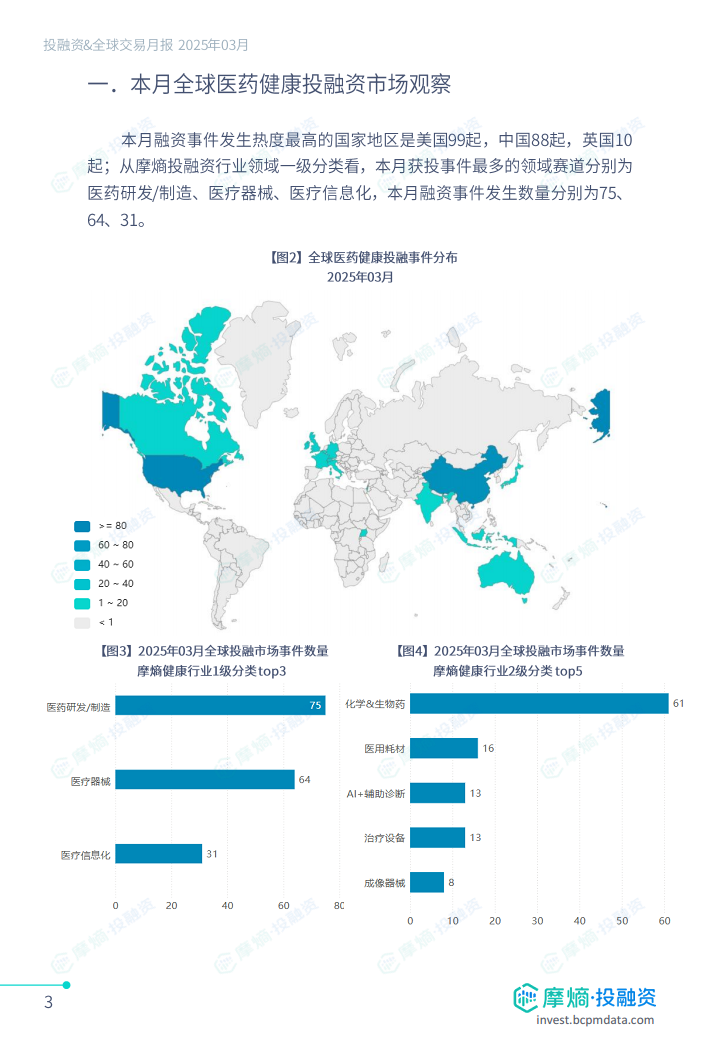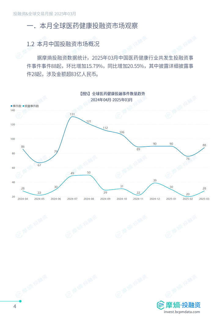 全球医药健康投融资市场在2025年3月呈现增长放缓的趋势,但中国市场却保持了较高的增长速度,这反映出中国医药健康行业持续的活力和发展潜力。