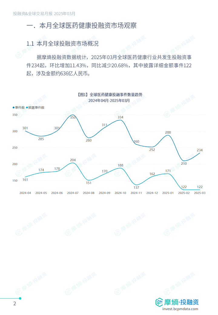 据摩熵投融资数据统计,2025年03月全球医药健康行业共发生投融资事件234起,环比增加11.43%,同比减少20.68%,其中披露详细金额事件122起,涉及金额约636亿人民币。