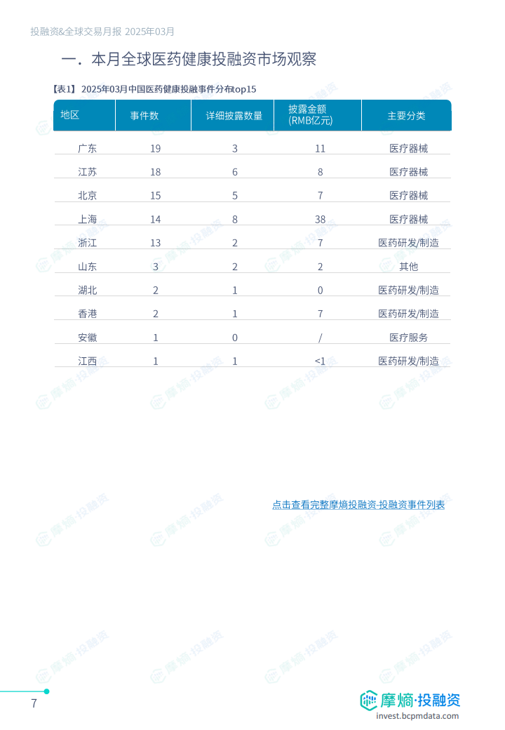 2025年3月,中国医药健康行业共发生投融资事件88起,环比增长15.79%,同比增长20.55%。披露金额的事件共28起,涉及金额超过83亿人民币。广东、江苏和北京是融资事件发生最频繁的地区。