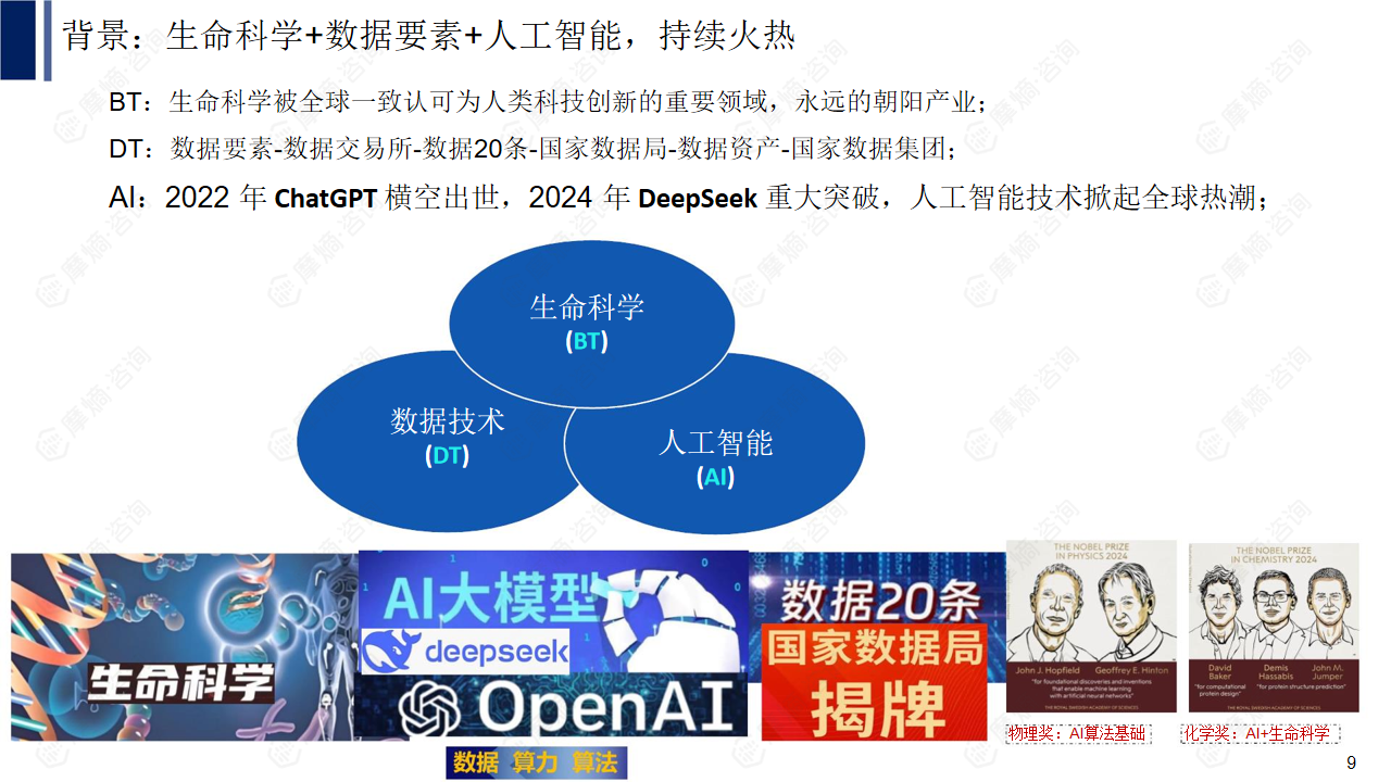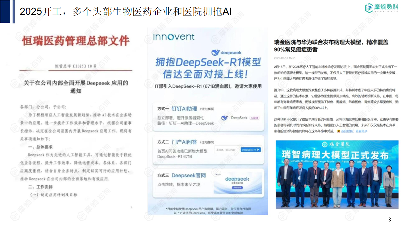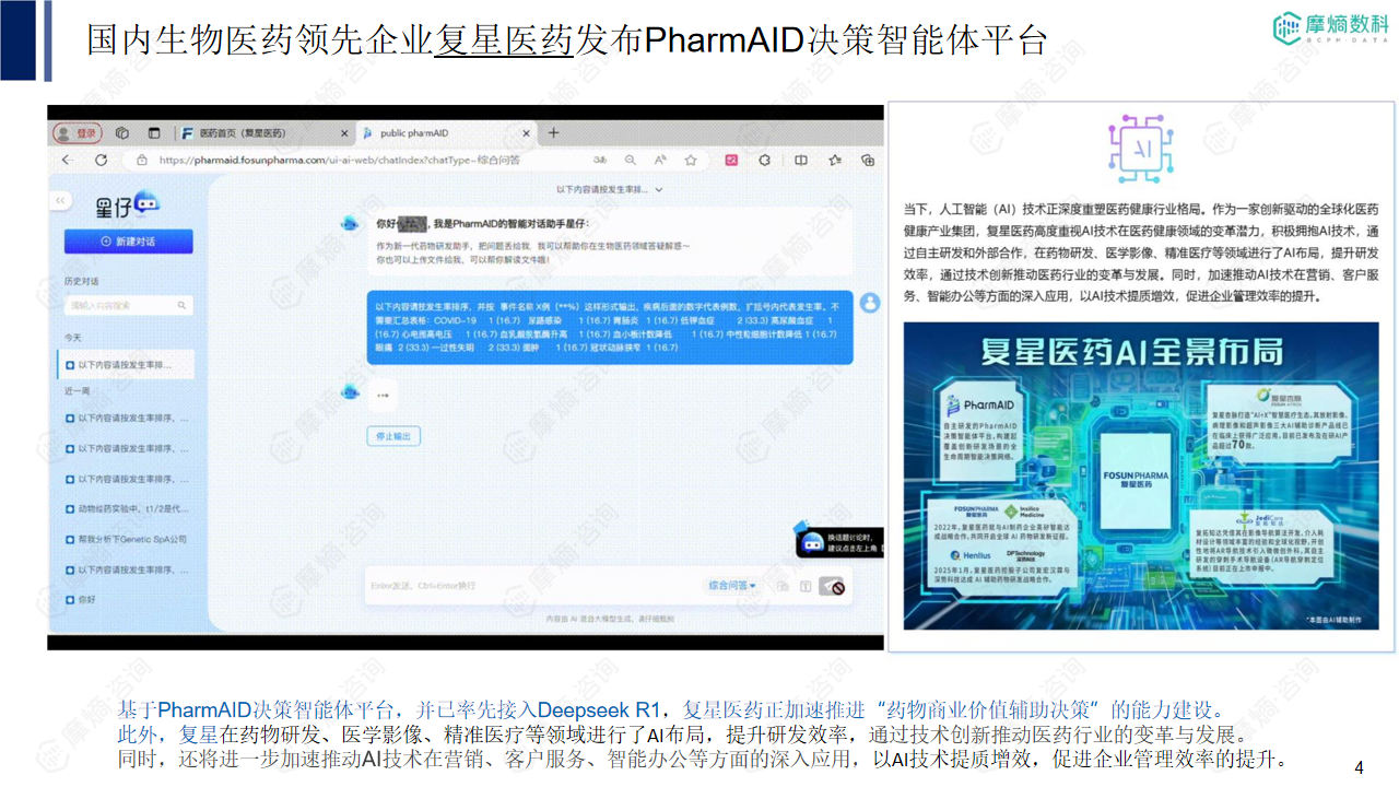 本报告的核心观点是:基于大模型的医药知识工程系统,例如DeepSeek R1,正在深刻地改变生物医药行业的各个环节,从药物研发到市场营销,都展现出显著的提效潜力。报告通过对复星医药、东阳光药、拜耳等头部企业的案例分析,以及对DeepSeek系统构成、部署方案和摩熵数科数据基础的详细解读,论证了大模型技术在生物医药领域的应用价值和发展前景,并提出了针对不同企业需求的部署方案建议。 核心观点可总结为以下几点: