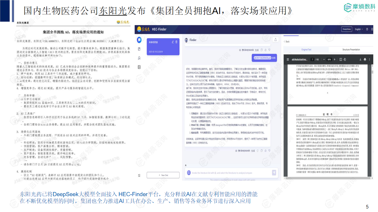大模型可以用于智能问答、知识科普、文案生成、会议纪要自动生成等,提升企业整体运营效率。东阳光药已将DeepSeek大模型全面接入HEC-Finder平台,充分释放AI在文献专利智能应用的潜能,并将其应用扩展到办公、生产、销售等各个业务环节。