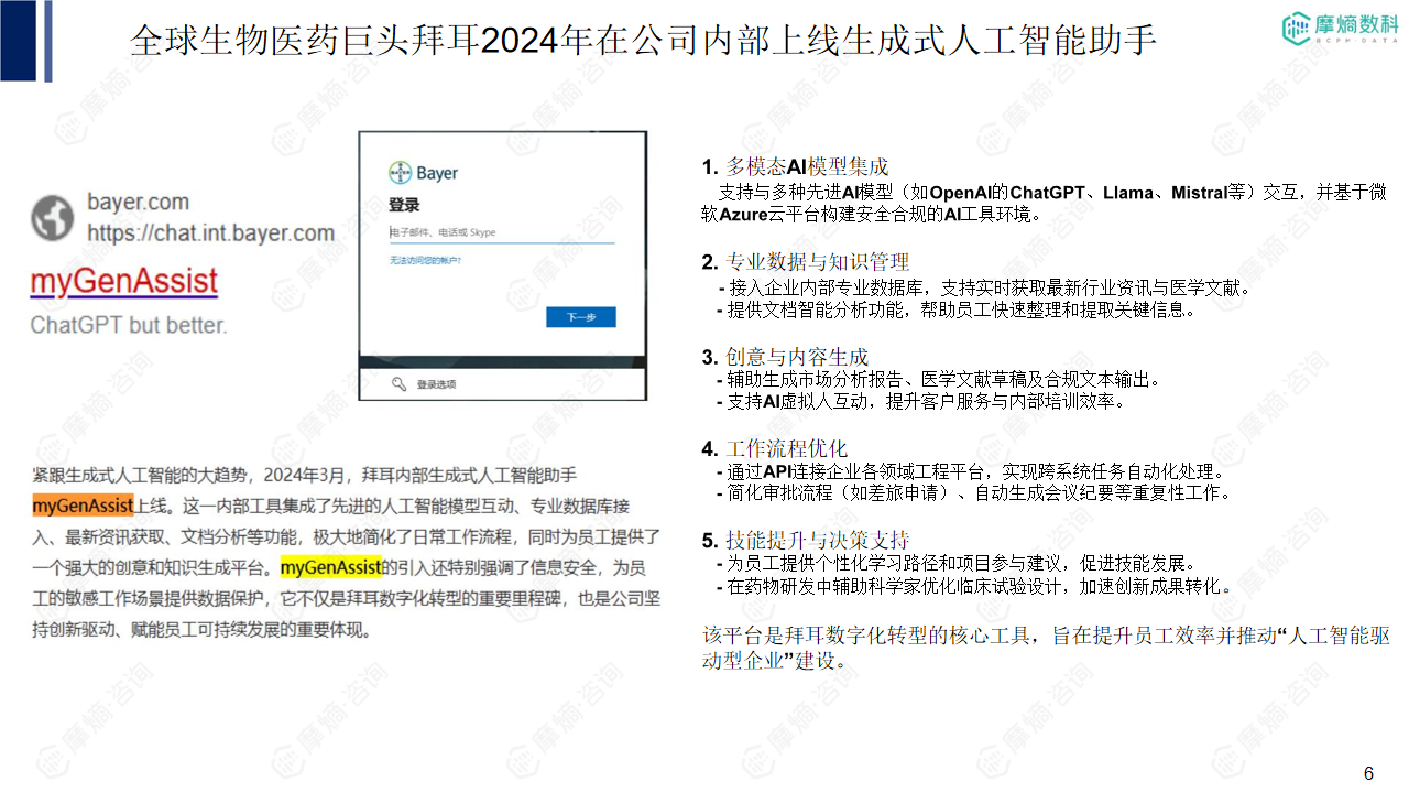 报告通过复星医药、东阳光药和拜耳等企业的案例,详细阐述了大模型技术在生物医药行业不同环节的应用,包括: