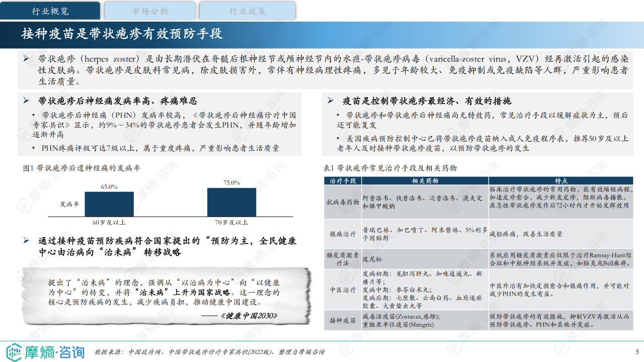 带状疱疹是由水痘-带状疱疹病毒(VZV)再激活引起的感染性皮肤病,常伴有神经痛,严重影响患者生活质量。疫苗接种是预防带状疱疹最有效的手段。报告指出,中国“治未病”理念的提出,以及居民医疗保健消费的持续增长,都为带状疱疹疫苗市场提供了有利的政策和市场环境。