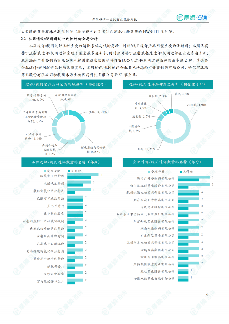 本周共有68项仿制药申报上市/申报临床获CDE承办,其中新注册分类上市申请受理号67项,一致性评价申请1项。9个品种通过一致性评价,40个品种视同通过一致性评价。本周有4项生物类似物注册申报动态。数据显示,仿制药市场竞争激烈,一致性评价是推动仿制药市场规范化发展的重要举措。消化系统与代谢药物以及注射剂是过评/视同过评品种的主要类别。法莫替丁注射液过评/视同过评受理号数量最多,过评/视同过评企业也最多。