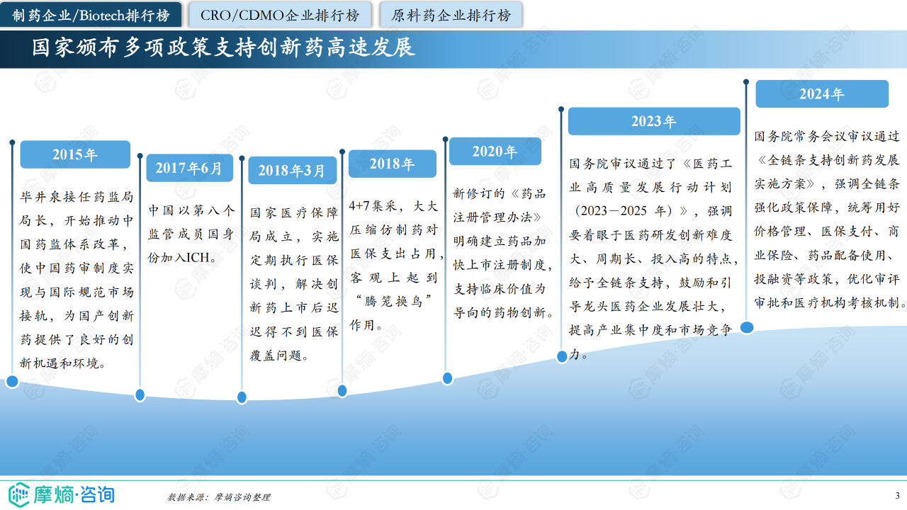 报告提及国家颁布多项政策支持创新药高速发展,包括《全链条支持创新药发展实施方案》和《医药工业高质量发展行动计划》,以及医保谈判等政策对创新药上市后医保覆盖的影响。 报告还分析了MAH制度对CDMO市场发展的影响,以及环保政策对原料药行业的影响。