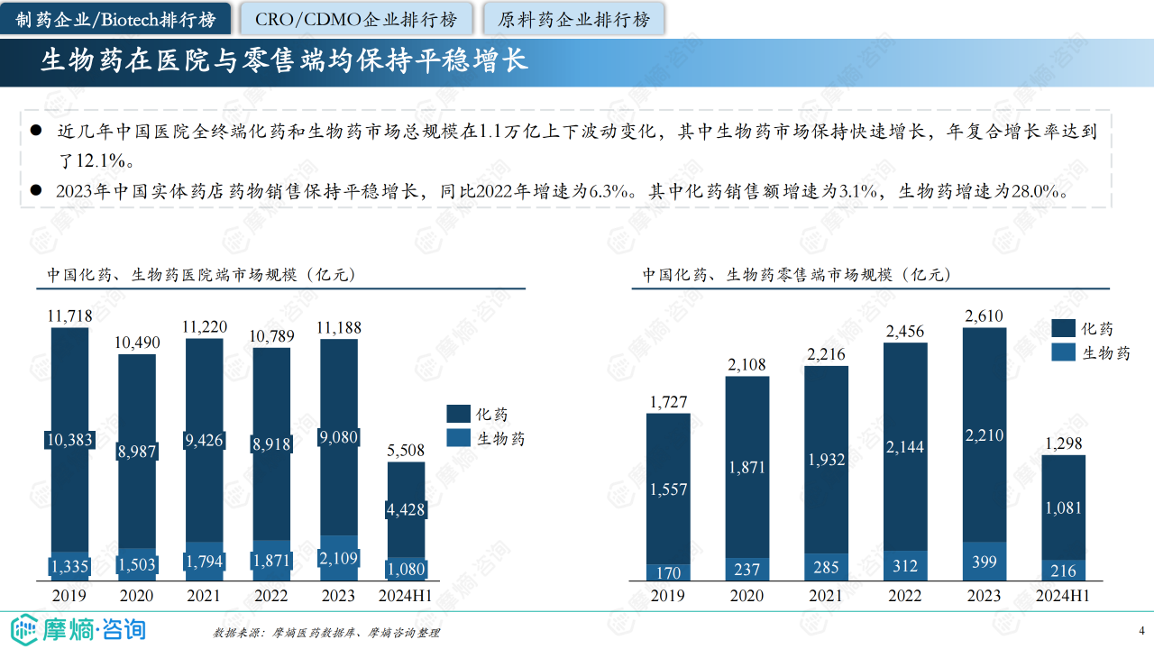 报告提供了中国化药、生物药医院端和零售端市场规模数据,显示生物药市场保持快速增长。同时,报告还分析了中国化药及生物药ATC分类市场份额,指出抗肿瘤药和免疫调节药物市场份额逐年提升。