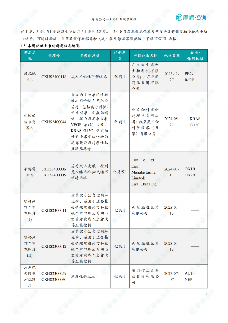 本周共有6款新药获批上市,包括昂拉地韦片(治疗成人单纯性甲型流感)、枸橼酸格来雷塞片(治疗KRAS G12C突变阳性的结直肠癌)、莱博雷生片(治疗成人失眠)、瑞格列汀二甲双胍片(治疗2型糖尿病)、以及沙库巴曲阿利沙坦钙片(治疗原发性高血压)。报告对这些药物的适应症、研发企业以及作用机制进行了详细介绍。