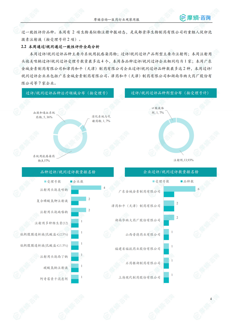 报告分析了本周通过一致性评价品种的治疗领域分布和剂型分布,并对过评品种数量排名和企业过评数量排名进行了统计分析,揭示了国内仿制药市场竞争的激烈程度。