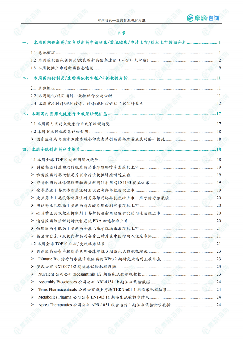 本报告基于摩熵咨询医药行业观察周报的数据,对国内外医药市场进行了全面的分析。国内创新药市场持续向好,多款重磅药物获批,展现了中国医药创新的实力;仿制药市场竞争激烈,一致性评价持续推进,推动行业规范化发展;国家政策持续支持创新药发展,为行业发展创造了良好的环境。全球创新药研发也取得了显著进展,多个药物的临床试验结果积极,为患者带来了新的治疗希望。 本报告的数据分析为医药行业从业者提供了重要的市场信息和参考依据。 需要注意的是,报告数据基于摩熵医药数据库,更详细的数据和分析可通过摩熵医药数据库或联系摩熵客服获取。