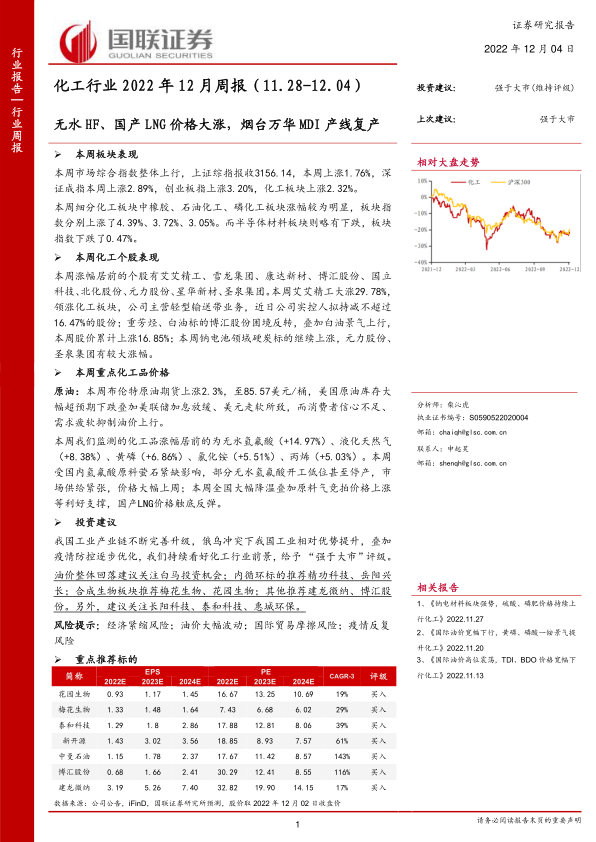 化工行业2022年12月周报:无水HF、国产LNG价格大涨,烟台万华MDI产线复产