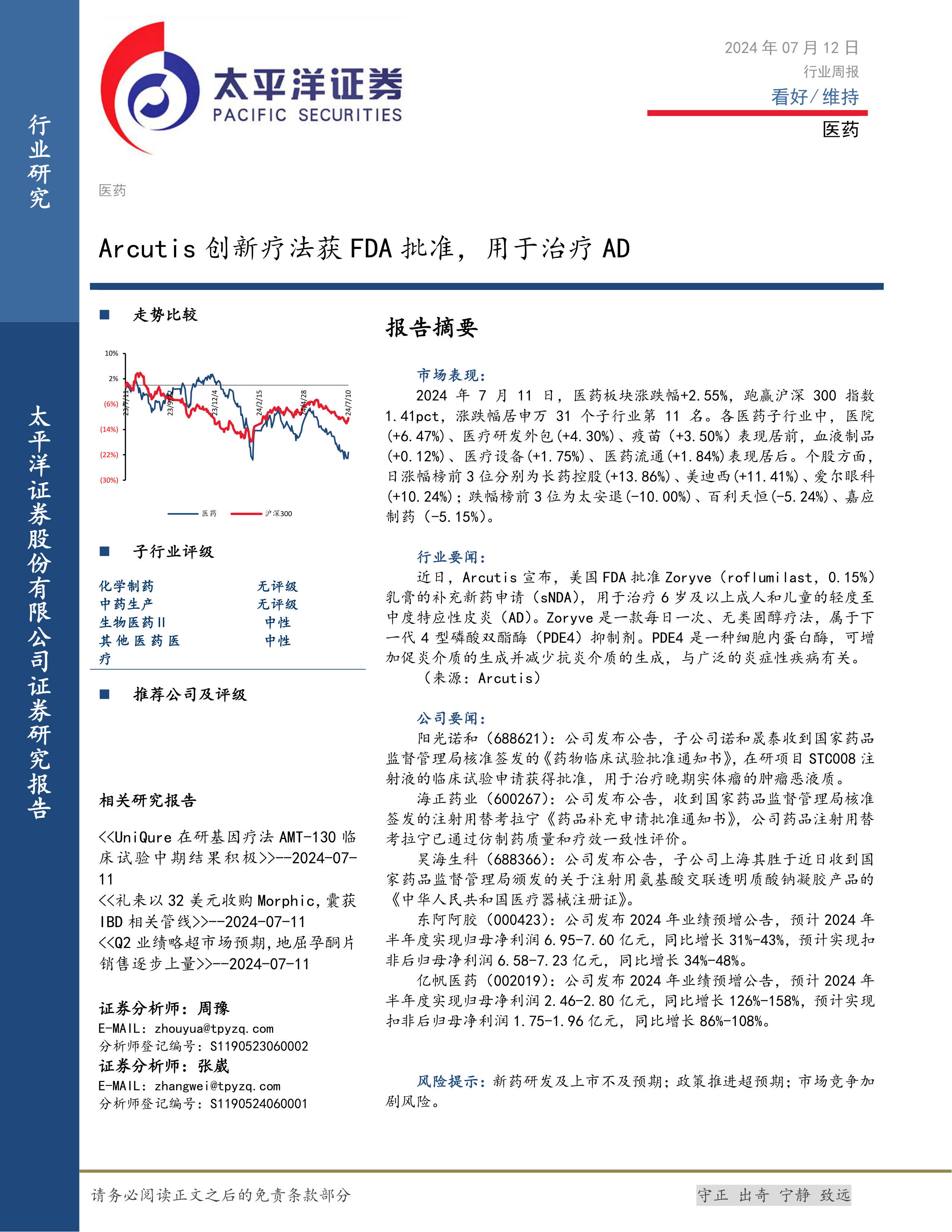 医药行业周报:Arcutis创新疗法获FDA批准,用于治疗AD