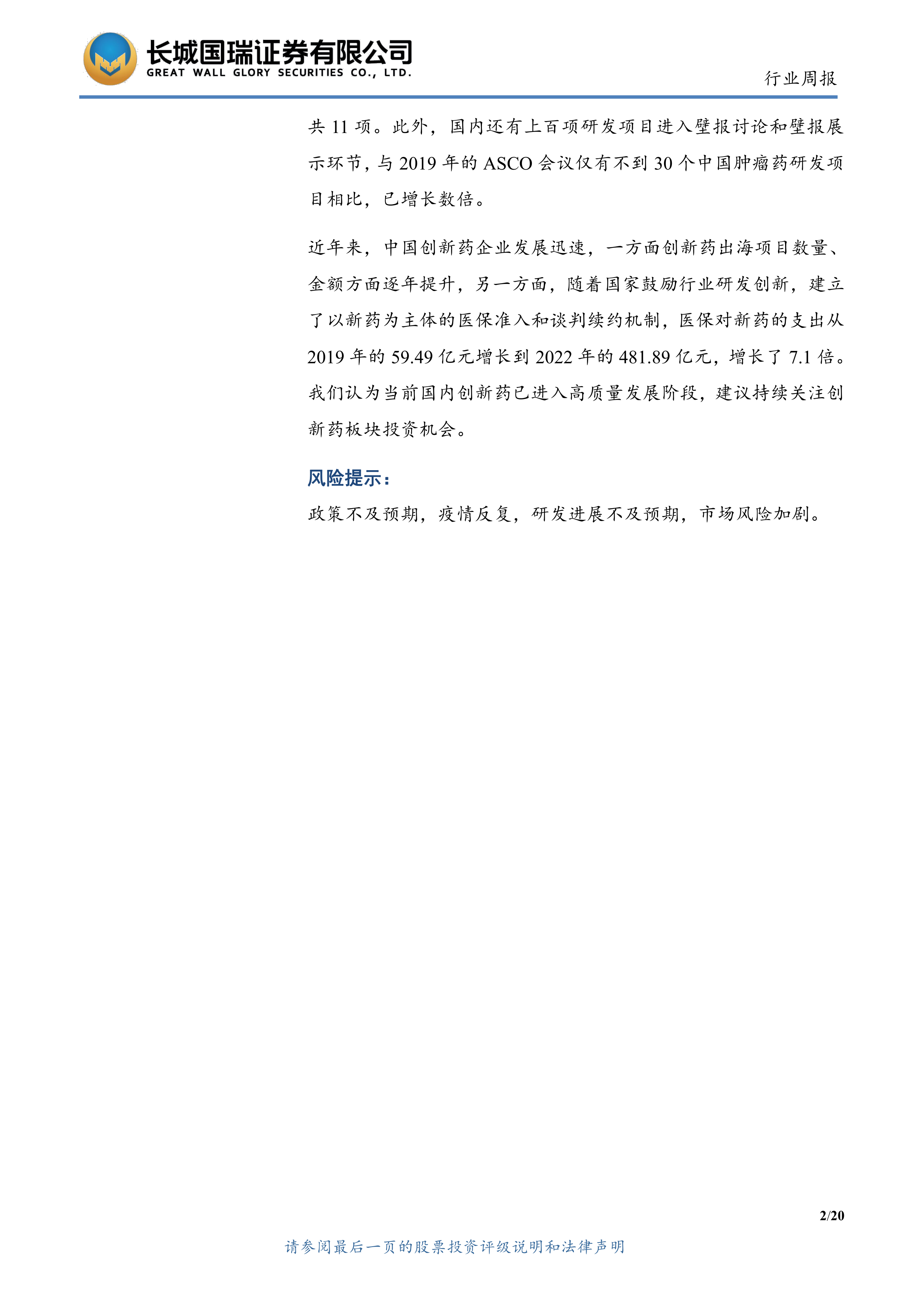 近年来,中国创新药企业发展迅速,一方面创新药出海项目数量、金额方面逐年提升,另一方面,随着国家鼓励行业研发创新,建立了以新药为主体的医保准入和谈判续约机制,医保对新药的支出从2019年的59.49亿元增长到2022年的481.89亿元,增长了7.1倍。我们认为当前国内创新药已进入高质量发展阶段,建议持续关注创新药板块投资机会。