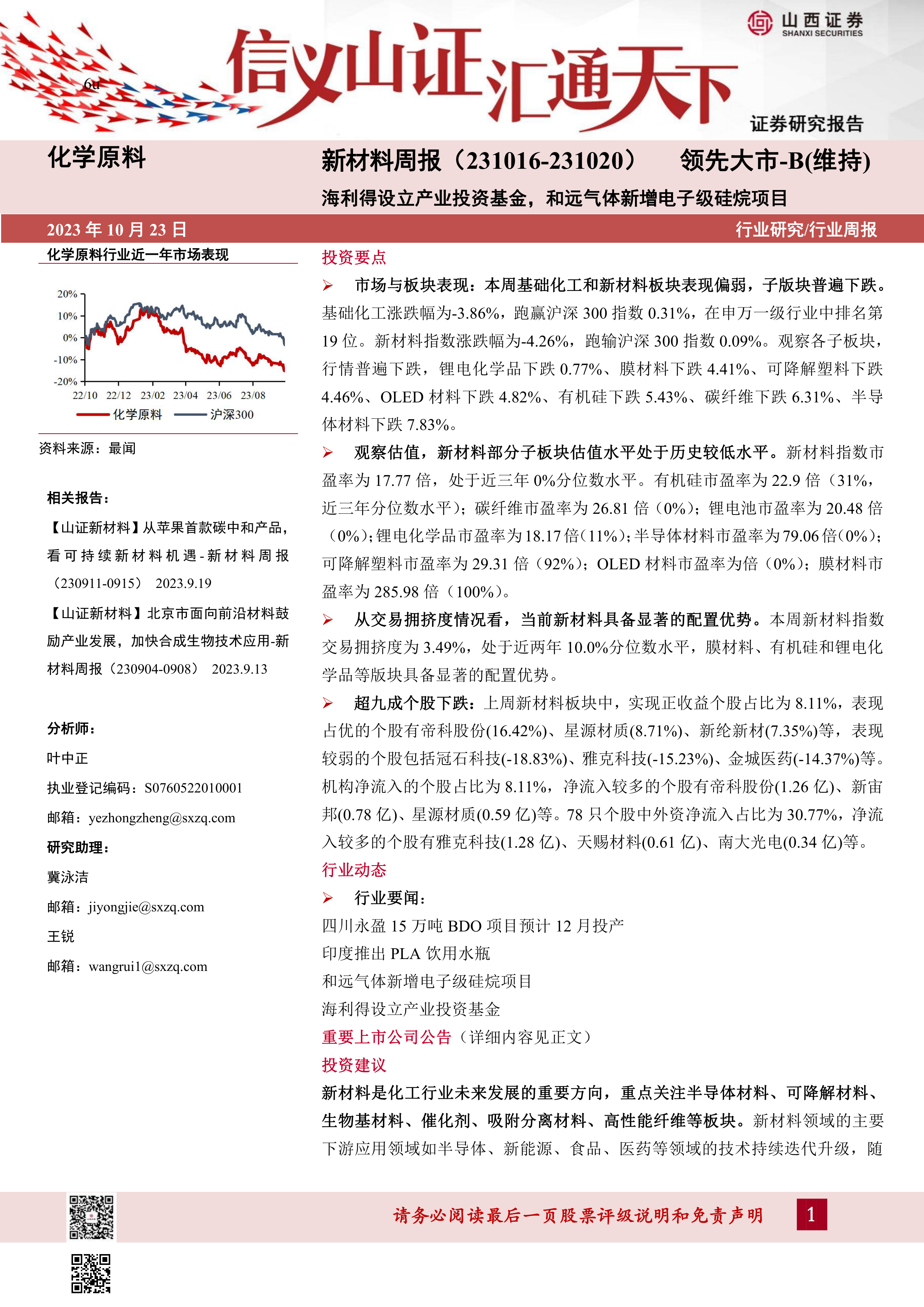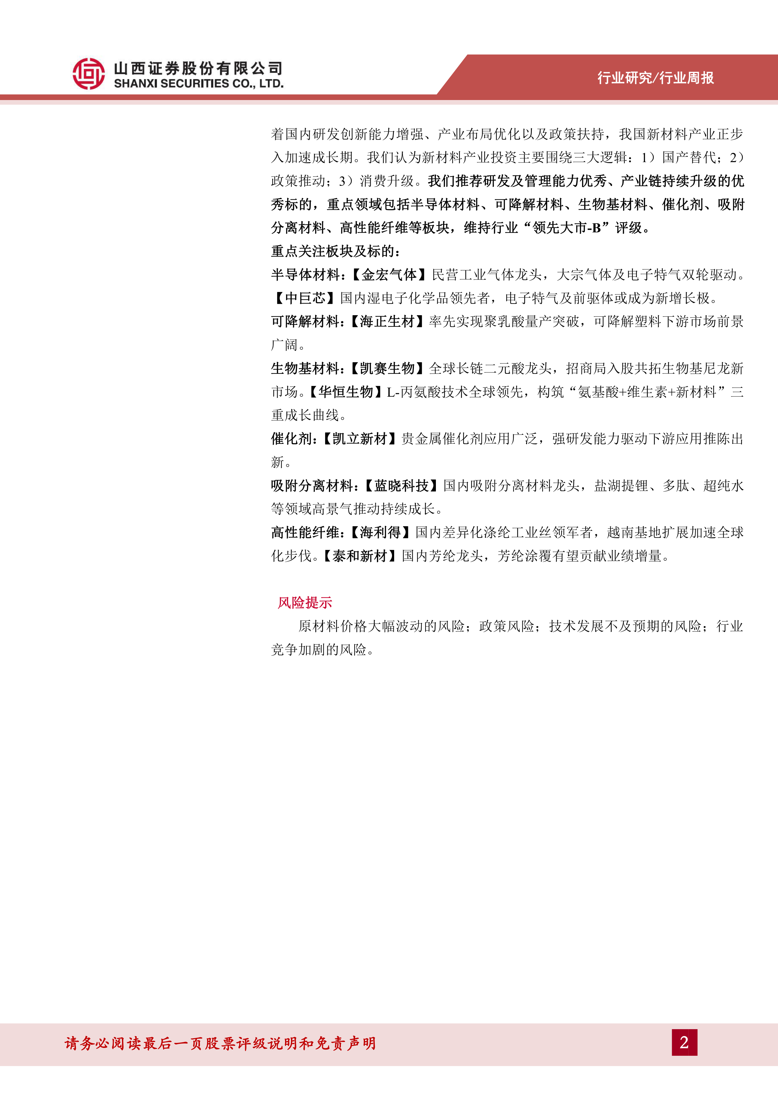 新材料是化工行业未来发展的重要方向,重点关注半导体材料、可降解材料、生物基材料、催化剂、吸附分离材料、高性能纤维等板块。新材料领域的主要下游应用领域如半导体、新能源、食品、医药等领域的技术持续迭代升级,随着国内研发创新能力增强、产业布局优化以及政策扶持,我国新材料产业正步入加速成长期。我们认为新材料产业投资主要围绕三大逻辑:1)国产替代;2)政策推动;3)消费升级。我们推荐研发及管理能力优秀、产业链持续升级的优秀标的,重点领域包括半导体材料、可降解材料、生物基材料、催化剂、吸附分离材料、高性能纤维等板块,维持行业“领先大市-B”评级。