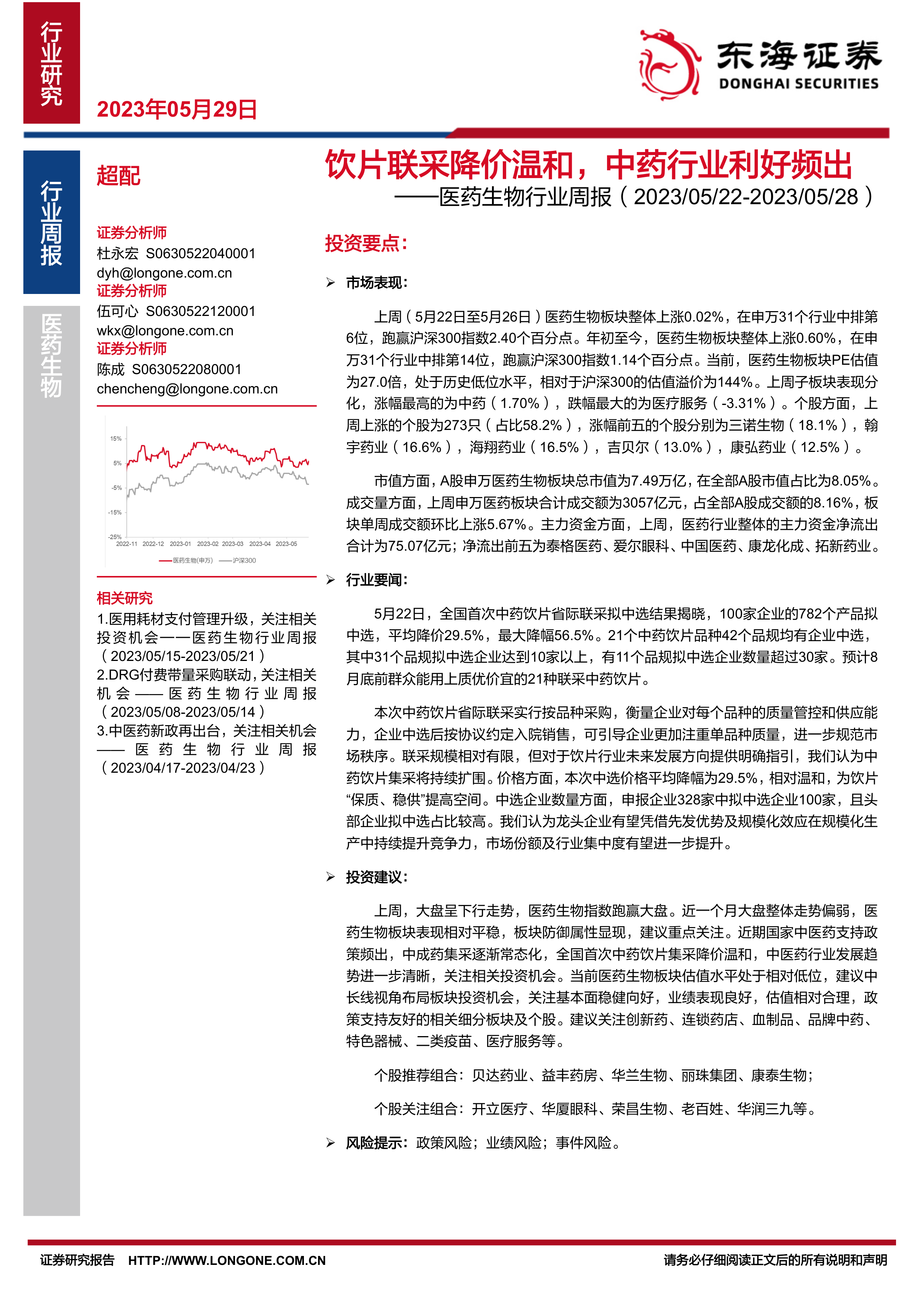 个股关注组合:开立医疗、华厦眼科、荣昌生物、老百姓、华润三九等。