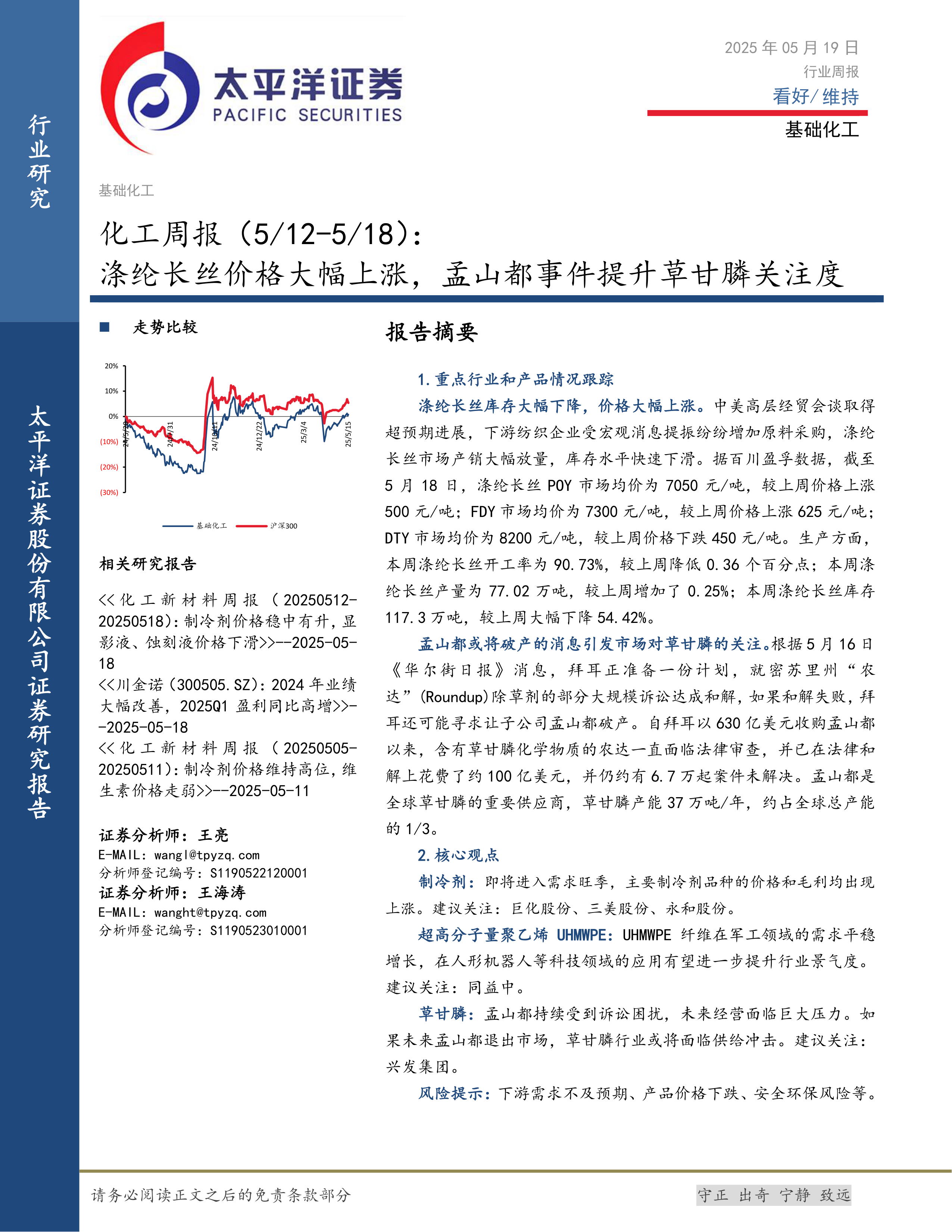 化工行业周报:涤纶长丝价格大幅上涨,孟山都事件提升草甘膦关注度