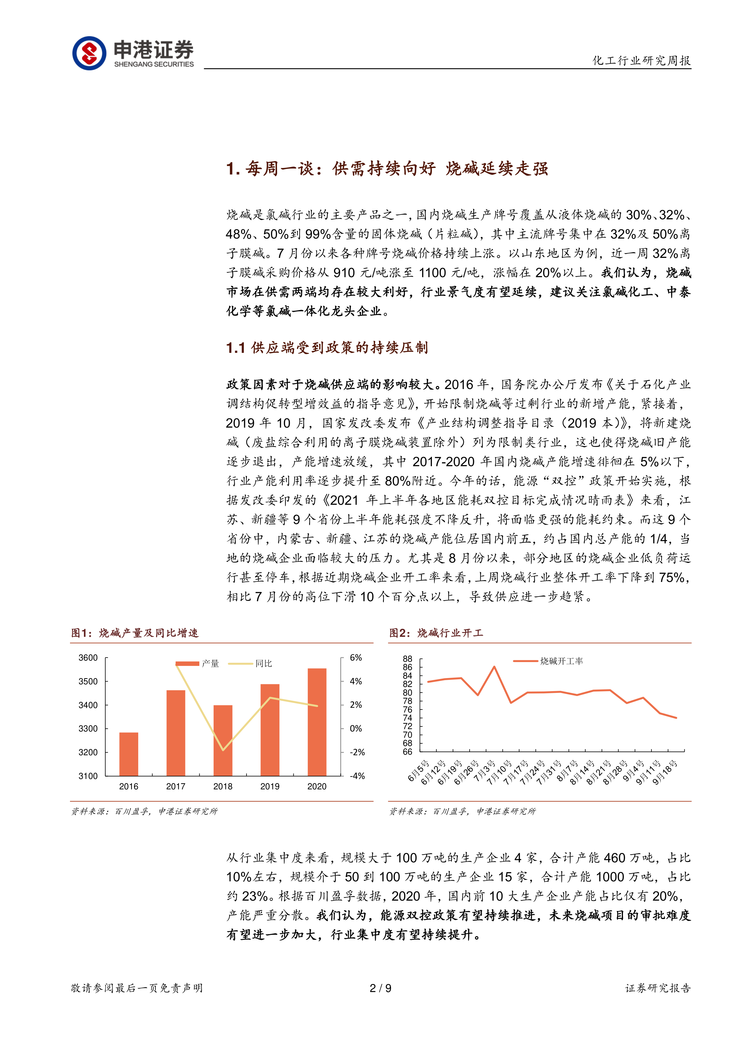 投资建议:政策因素对于烧碱供应端的影响较大,随着能源双控政策的推进,烧碱行业集中度有望持续提升,其在供需两端均存在较大利好,行业景气度有望延续,建议关注具备原料优势的氯碱化工、中泰化学等一体化龙头企业。