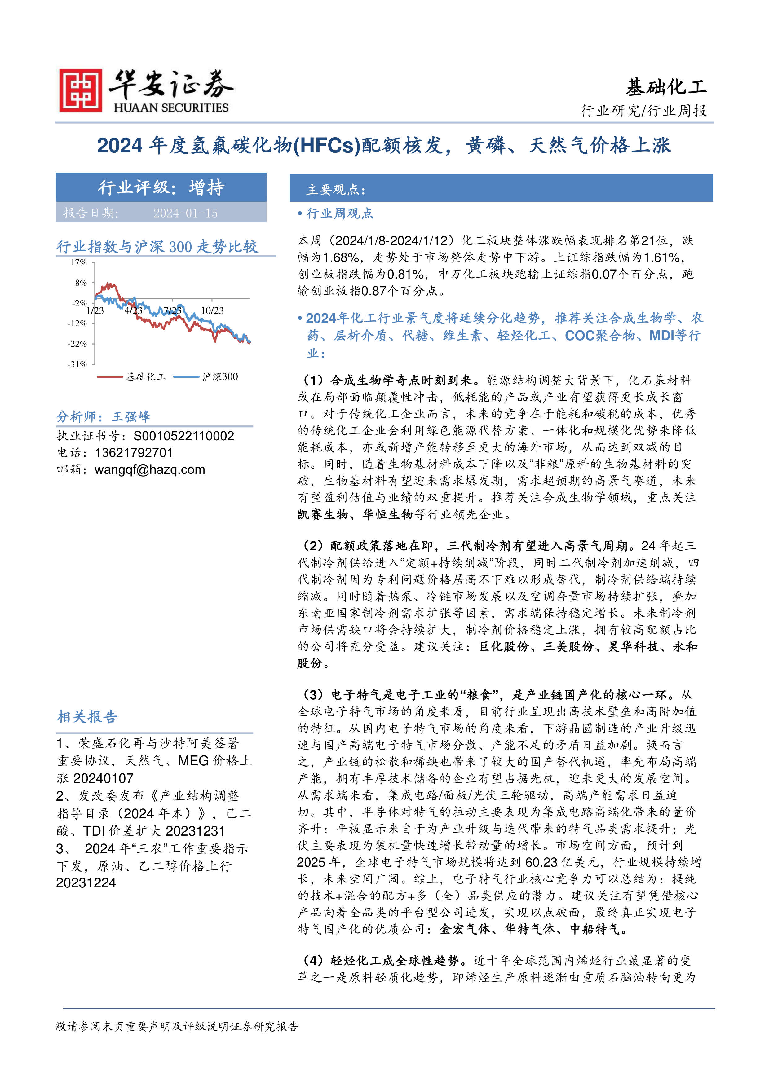 基础化工行业周报:2024年度氢氟碳化物(HFCs)配额核发,黄磷、天然气价格上涨