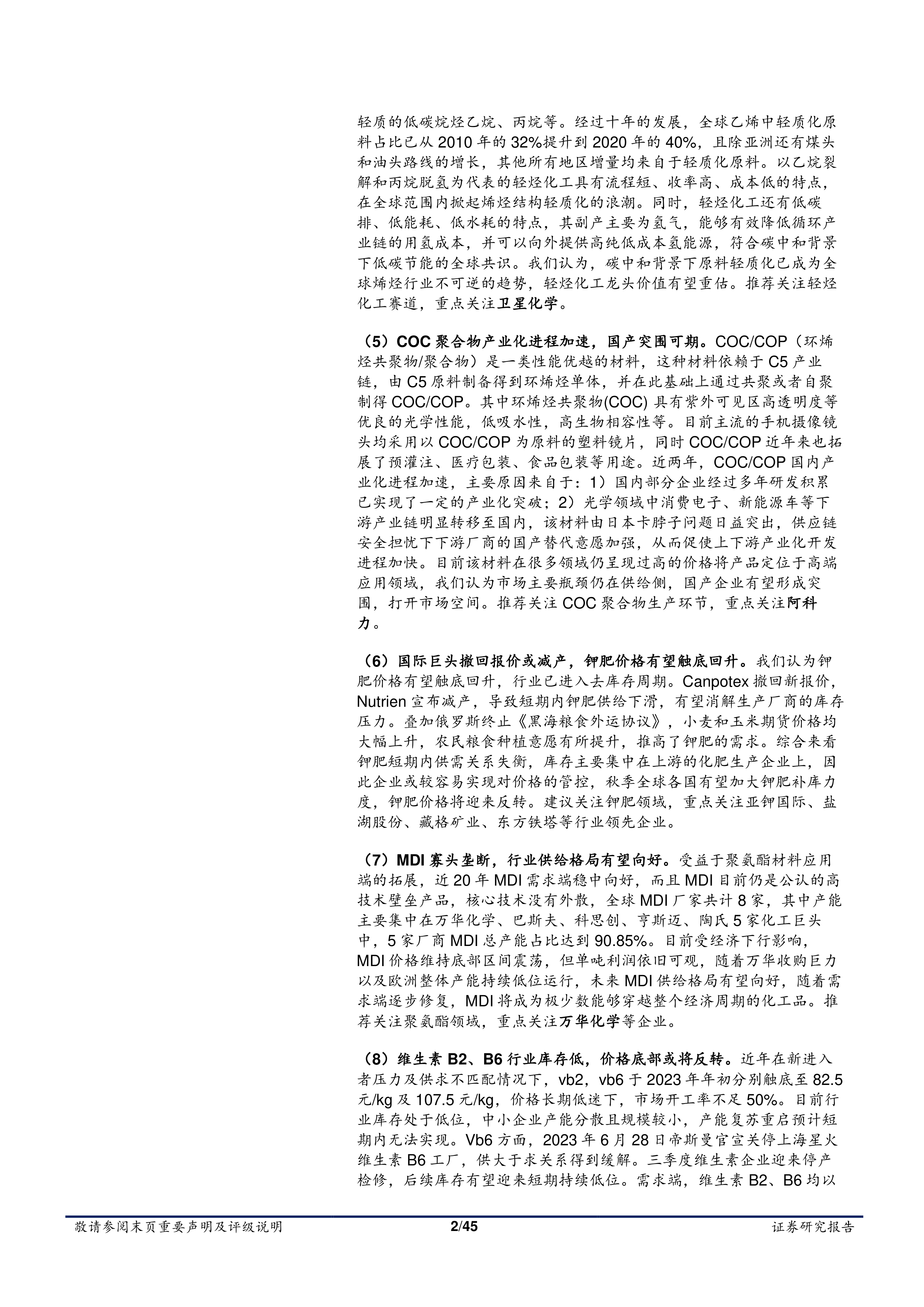 (4)轻烃化工成全球性趋势。 近十年全球范围内烯烃行业最显著的变革之一是原料轻质化趋势,即烯烃生产原料逐渐由重质石脑油转向更为轻质的低碳烷烃乙烷、丙烷等。经过十年的发展,全球乙烯中轻质化原料占比已从 2010 年的 32%提升到 2020 年的 40%,且除亚洲还有煤头和油头路线的增长,其他所有地区增量均来自于轻质化原料。以乙烷裂解和丙烷脱氢为代表的轻烃化工具有流程短、收率高、成本低的特点,在全球范围内掀起烯烃结构轻质化的浪潮。同时,轻烃化工还有低碳排、低能耗、低水耗的特点,其副产主要为氢气,能够有效降低循环产业链的用氢成本,并可以向外提供高纯低成本氢能源,符合碳中和背景下低碳节能的全球共识。我们认为,碳中和背景下原料轻质化已成为全球烯烃行业不可逆的趋势,轻烃化工龙头价值有望重估。推荐关注轻烃化工赛道,重点关注卫星化学。(5) COC 聚合物产业化进程加速,国产突围可期。 COC/COP(环烯烃共聚物/聚合物)是一类性能优越的材料,这种材料依赖于 C5 产业链,由 C5 原料制备得到环烯烃单体,并在此基础上通过共聚或者自聚制得 COC/COP。其中环烯烃共聚物(COC) 具有紫外可见区高透明度等优良的光学性能,低吸水性,高生物相容性等。目前主流的手机摄像镜头均采用以 COC/COP 为原料的塑料镜片,同时 COC/COP 近年来也拓展了预灌注、医疗包装、食品包装等用途。近两年, COC/COP 国内产业化进程加速,主要原因来自于: 1)国内部分企业经过多年研发积累已实现了一定的产业化突破; 2)光学领域中消费电子、新能源车等下游产业链明显转移至国内,该材料由日本卡脖子问题日益突出,供应链安全担忧下下游厂商的国产替代意愿加强,从而促使上下游产业化开发进程加快。目前该材料在很多领域仍呈现过高的价格将产品定位于高端应用领域,我们认为市场主要瓶颈仍在供给侧,国产企业有望形成突围,打开市场空间。推荐关注 COC 聚合物生产环节,重点关注阿科力。(6)国际巨头撤回报价或减产,钾肥价格有望触底回升。 我们认为钾肥价格有望触底回升,行业已进入去库存周期。 Canpotex 撤回新报价,Nutrien 宣布减产,导致短期内钾肥供给下滑,有望消解生产厂商的库存压力。叠加俄罗斯终止《黑海粮食外运协议》,小麦和玉米期货价格均大幅上升,农民粮食种植意愿有所提升,推高了钾肥的需求。综合来看钾肥短期内供需关系失衡,库存主要集中在上游的化肥生产企业上,因此企业或较容易实现对价格的管控,秋季全球各国有望加大钾肥补库力度,钾肥价格将迎来反转。建议关注钾肥领域,重点关注亚钾国际、盐湖股份、藏格矿业、东方铁塔等行业领先企业。