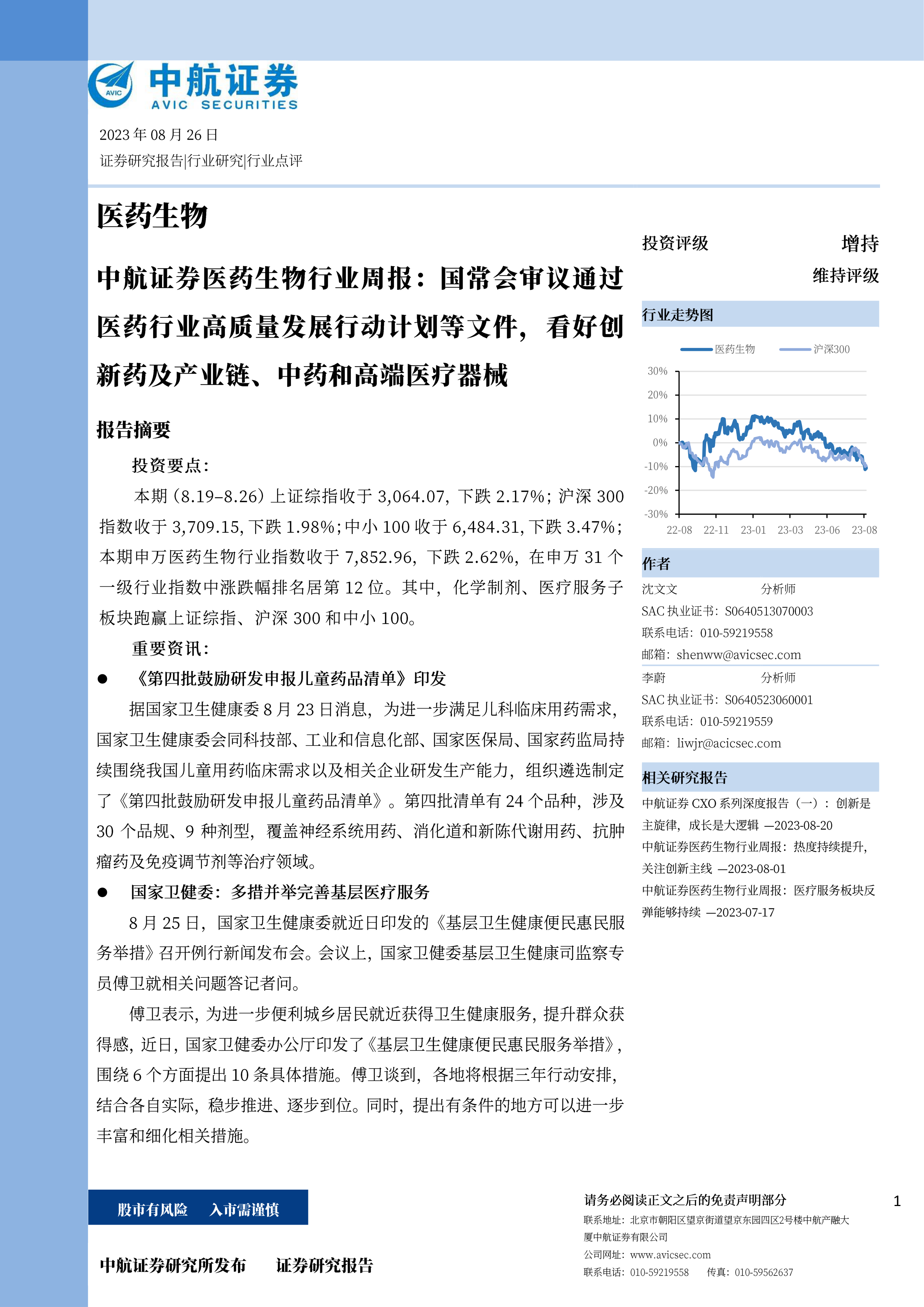 本期(8.19-8.26)上证综指收于3,064.07,下跌2.17%;沪深300指数收于3,709.15,下跌1.98%;中小100收于6,484.31,下跌3.47%;本期申万医药生物行业指数收于7,852.96,下跌2.62%,在申万31个作君级行业指数中涨跌幅排名居第12位。其中,化学制剂、医疗服务子沈文板块跑赢上证综指、沪深300和中小100SAC