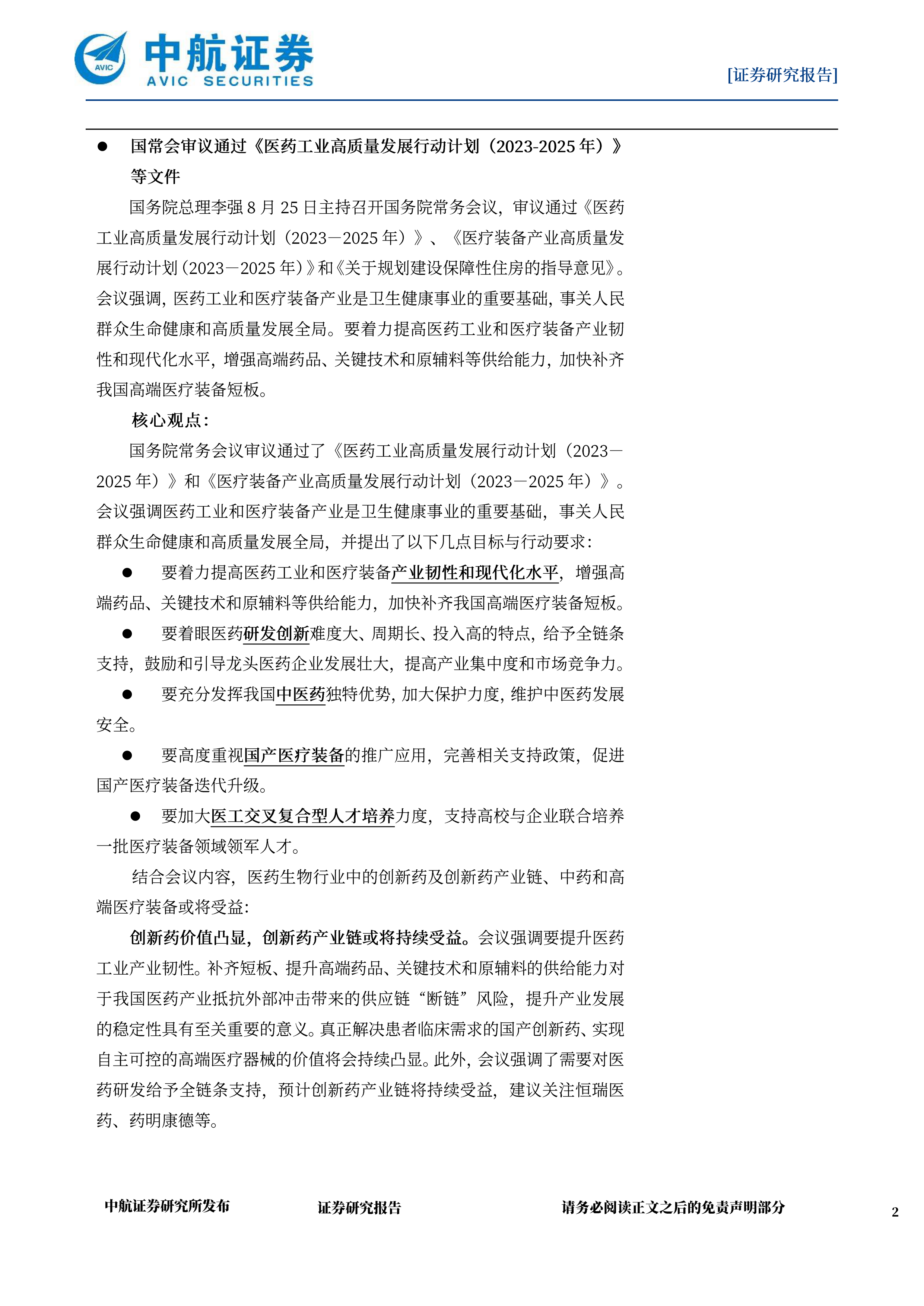 国务院常务会议审议通过了《医药工业高质量发展行动计划(2023-2025年)》和《医疗装备产业高质量发展行动计划(2023-2025年)》会议强调医药工业和医疗装备产业是卫生健康事业的重要基础,事关人民群众生命健康和高质量发展全局,并提出了以下几点日标与行动要求:要着力提高医药工业和医疗装备产业韧性和现代化水平,增强高端药品、关键技术和原辅料等供给能力,加快补齐我国高端医疗装备短板。