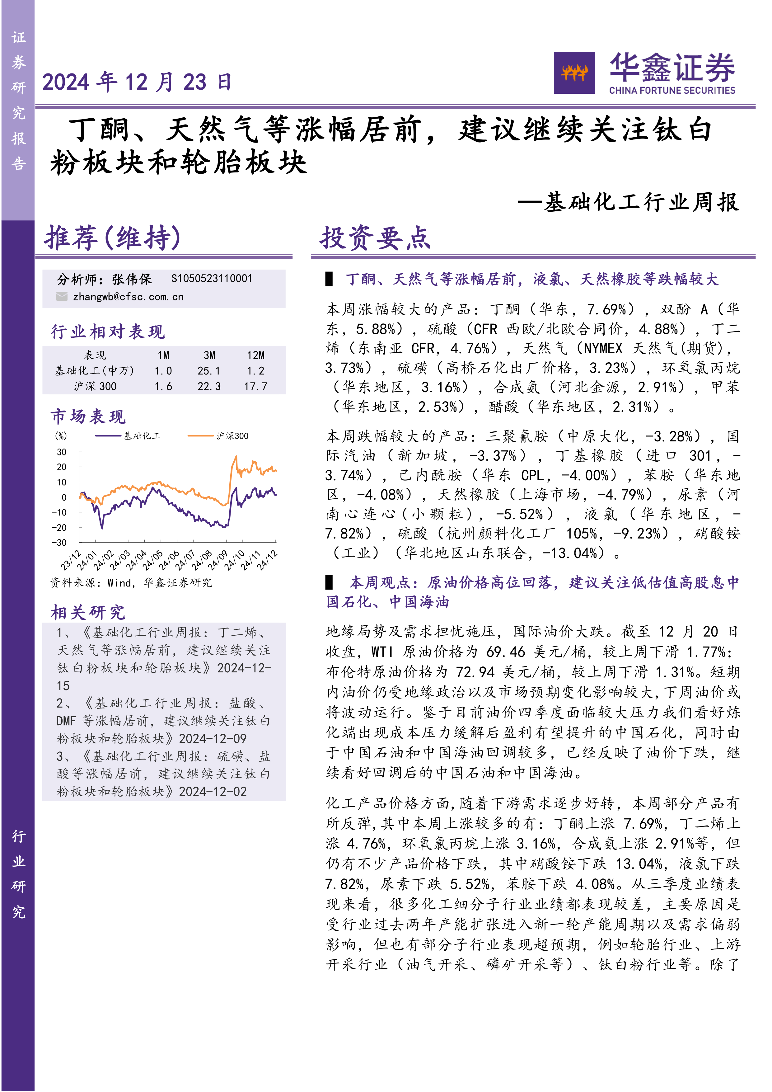 基础化工行业周报:丁酮、天然气等涨幅居前,建议继续关注钛白粉板块和轮胎板块