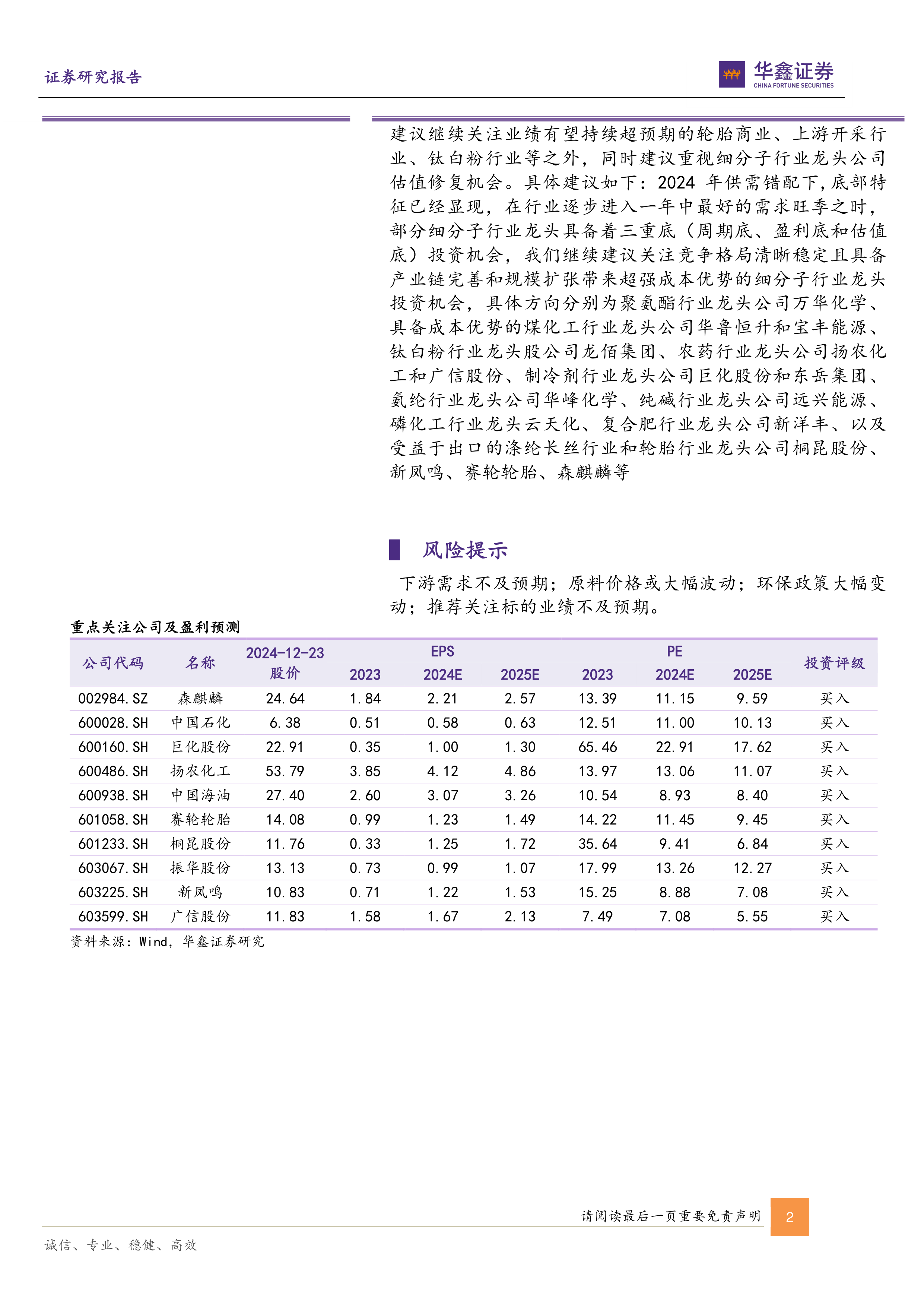 化工产品价格方面,随着下游需求逐步好转,本周部分产品有所反弹,其中本周上涨较多的有:丁酮上涨7.69%,丁二烯上涨4.76%,环氧氯丙烷上涨3.16%,合成氨上涨2.91%等,但仍有不少产品价格下跌,其中硝酸铵下跌13.04%,液氯下跌7.82%,尿素下跌5.52%,苯胺下跌4.08%。从三季度业绩表现来看,很多化工细分子行业业绩都表现较差,主要原因是受行业过去两年产能扩张进入新一轮产能周期以及需求偏弱影响,但也有部分子行业表现超预期,例如轮胎行业、上游开采行业(油气开采、磷矿开采等)、钛白粉行业等。除了建议继续关注业绩有望持续超预期的轮胎商业、上游开采行业、钛白粉行业等之外,同时建议重视细分子行业龙头公司估值修复机会。具体建议如下:2024年供需错配下,底部特征已经显现,在行业逐步进入一年中最好的需求旺季之时,部分细分子行业龙头具备着三重底(周期底、盈利底和估值底)投资机会,我们继续建议关注竞争格局清晰稳定且具备产业链完善和规模扩张带来超强成本优势的细分子行业龙头投资机会,具体方向分别为聚氨酯行业龙头公司万华化学、具备成本优势的煤化工行业龙头公司华鲁恒升和宝丰能源、钛白粉行业龙头股公司龙佰集团、农药行业龙头公司扬农化工和广信股份、制冷剂行业龙头公司巨化股份和东岳集团、氨纶行业龙头公司华峰化学、纯碱行业龙头公司远兴能源、磷化工行业龙头云天化、复合肥行业龙头公司新洋丰、以及受益于出口的涤纶长丝行业和轮胎行业龙头公司桐昆股份、新凤鸣、赛轮轮胎、森麒麟等
