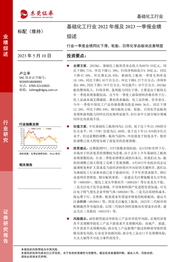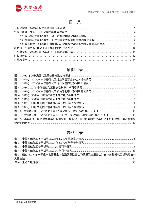 风险提示。油价剧烈波动导致化工产品价差收窄风险;宏观经济复苏不及预期导致化工产品下游需求不及预期风险;房地产、基建、汽车需求不及预期风险;部分化工产品新增产能过快释放导致供需格局恶化风险;行业竞争加剧风险;部分化工品出口不及预期风险;天灾人祸等不可抗力事件的发生。