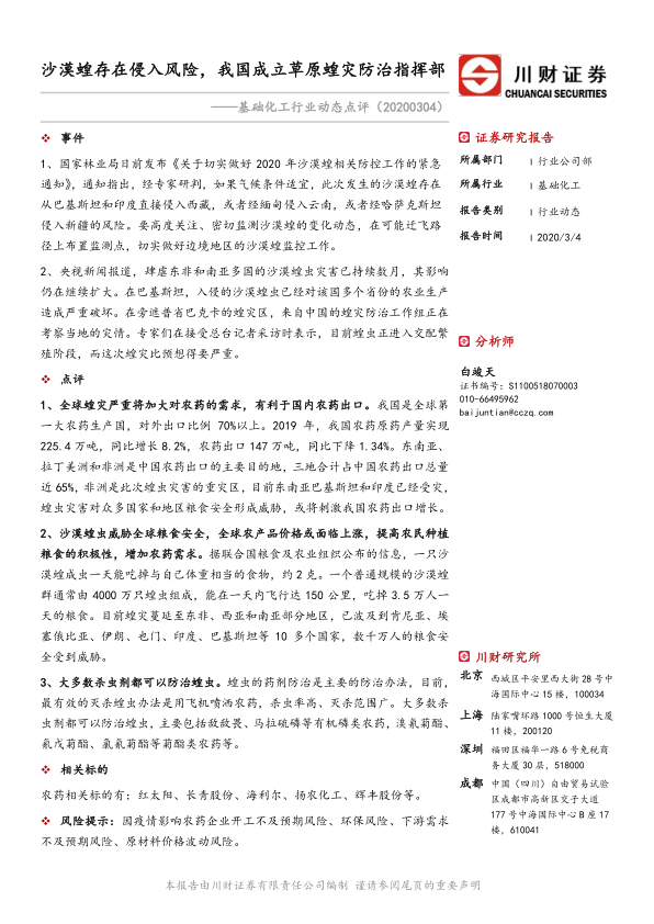 基础化工行业动态点评:沙漠蝗存在侵入风险,我国成立草原蝗灾防治指挥部
