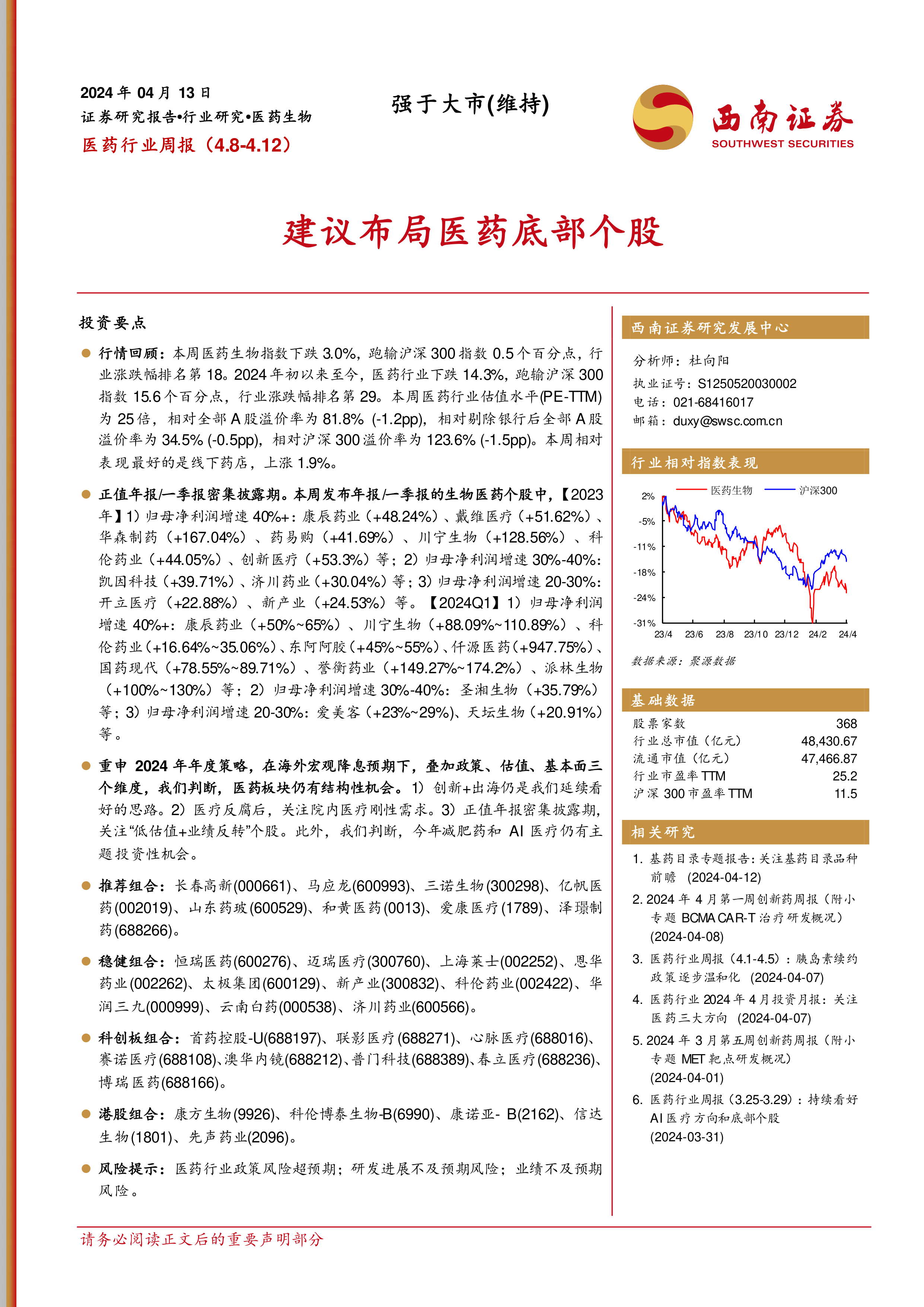 重申2024年年度策略,在海外宏观降息预期下,叠加政策、估值、基本面三个维度,我们判断,医药板块仍有结构性机会。1)创新+出海仍是我们延续看好的思路。2)医疗反腐后,关注院内医疗刚性需求。3)正值年报密集披露期,关注“低估值+业绩反转”个股。此外,我们判断,今年减肥药和AI医疗仍有主题投资性机会。