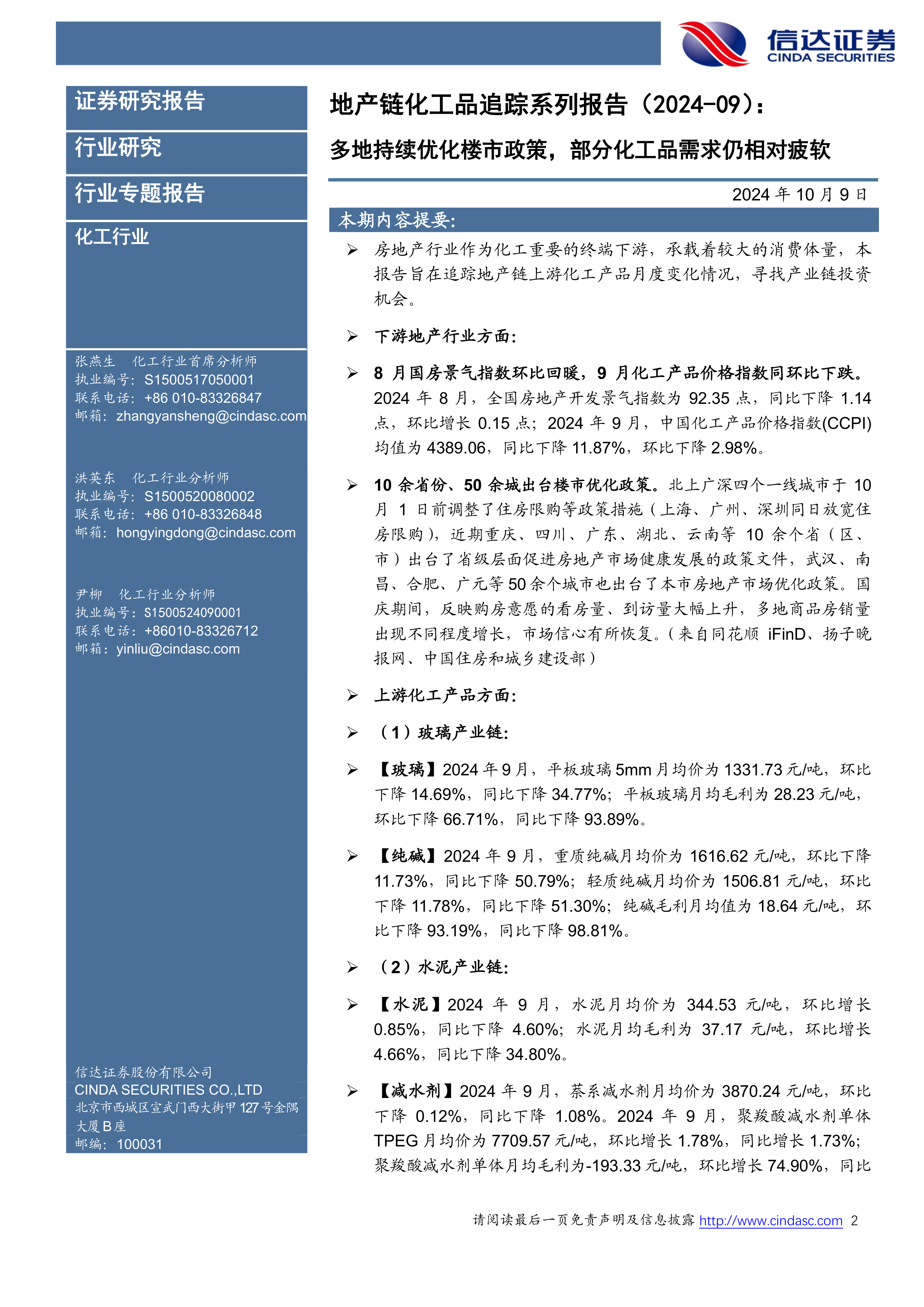 地产链化工品追踪系列报告(2024-09):多地持续优化楼市政策,部分化工品需求仍相对疲软