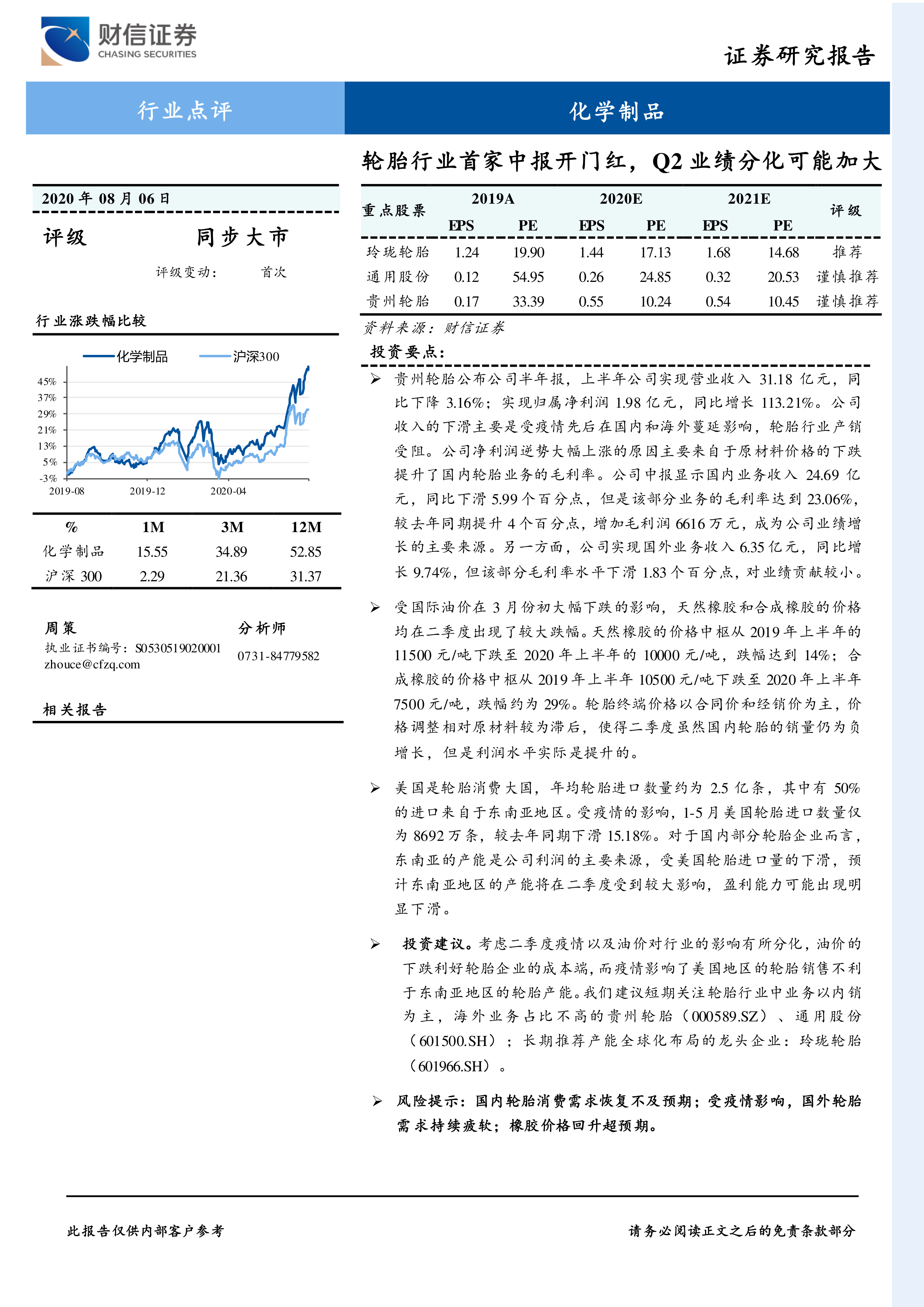 化学制品行业点评:轮胎行业首家中报开门红,Q2业绩分化可能加大