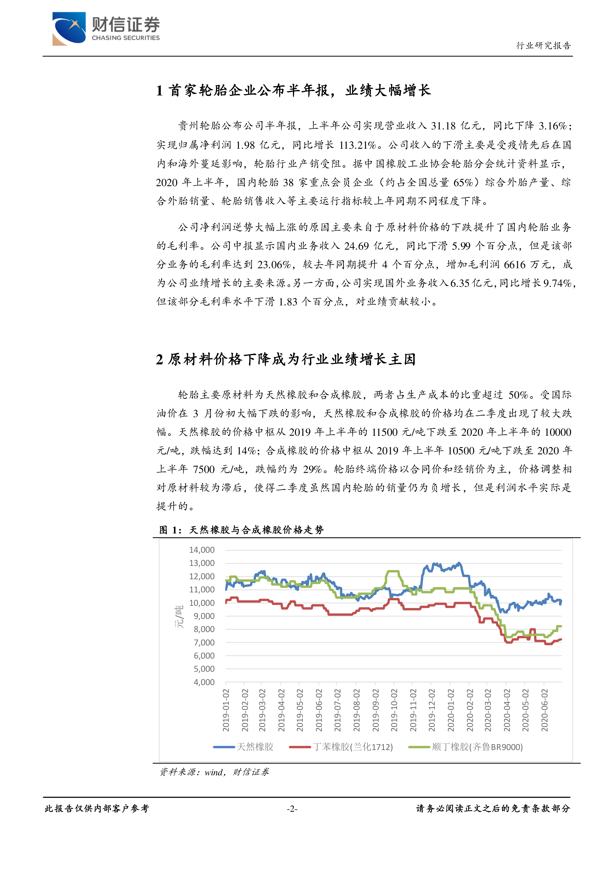 本报告分析了轮胎行业首家半年报的业绩表现,指出贵州轮胎业绩增长主要受益于原材料价格下跌。同时,报告分析了原材料价格波动、美国轮胎进口下滑等因素对行业的影响,并提出投资建议。 报告认为,二季度行业内部分化加剧,建议投资者关注内销为主的个股,并长期看好具备全球化布局的龙头企业。