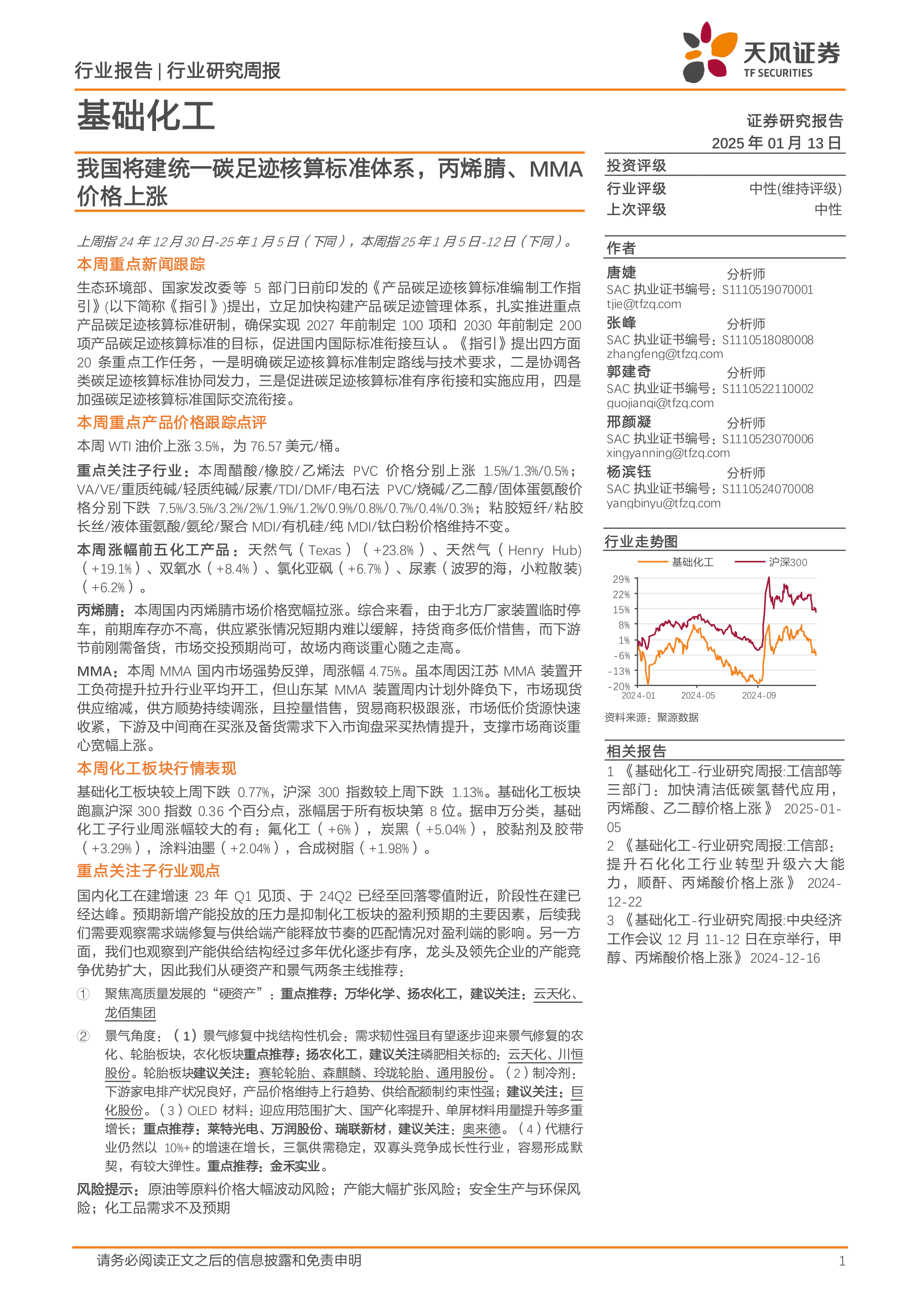 基础化工行业研究周报:我国将建统一碳足迹核算标准体系,丙烯腈、MMA价格上涨