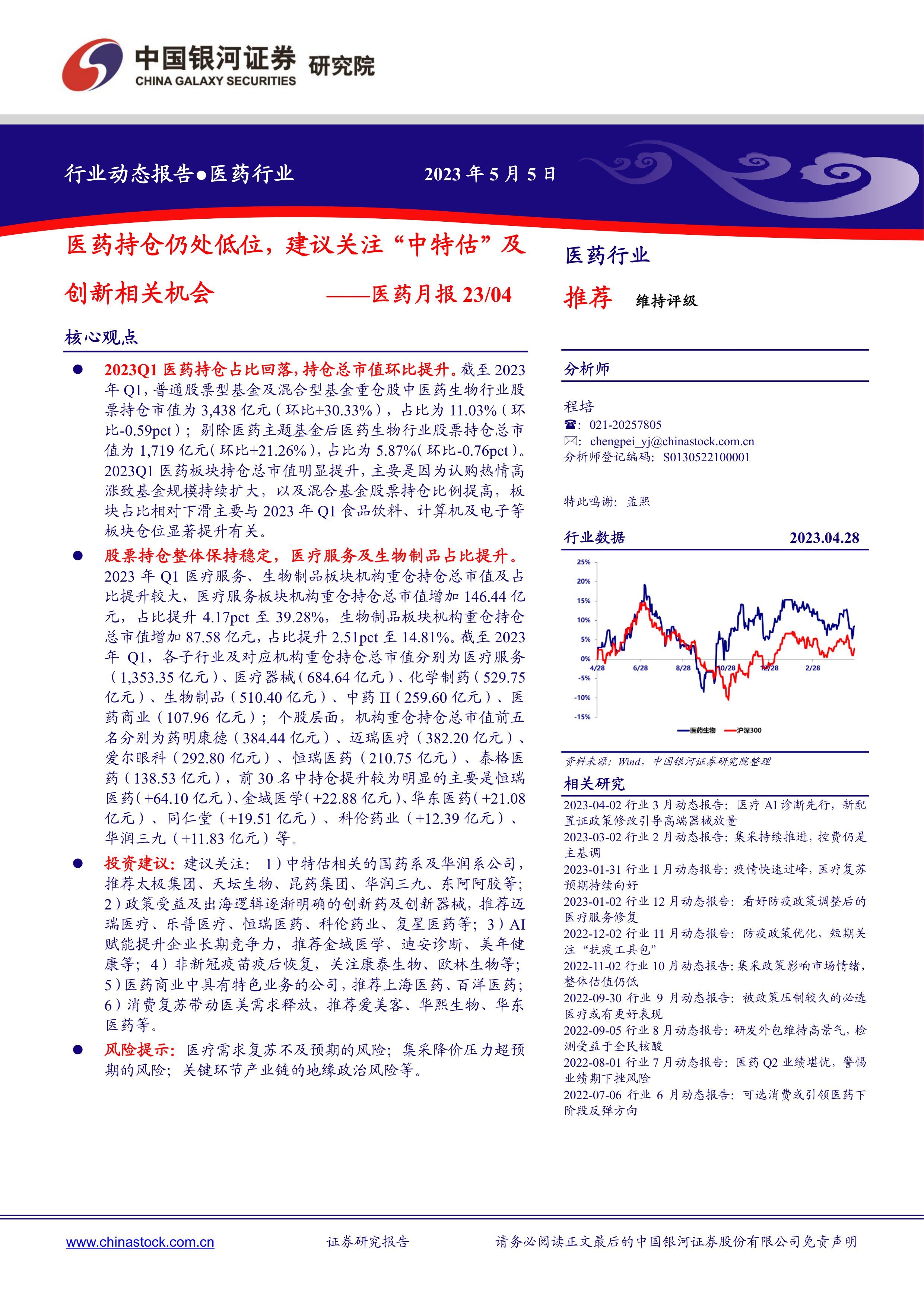 医药月报23/04:医药持仓仍处低位,建议关注“中特估”及创新相关机会