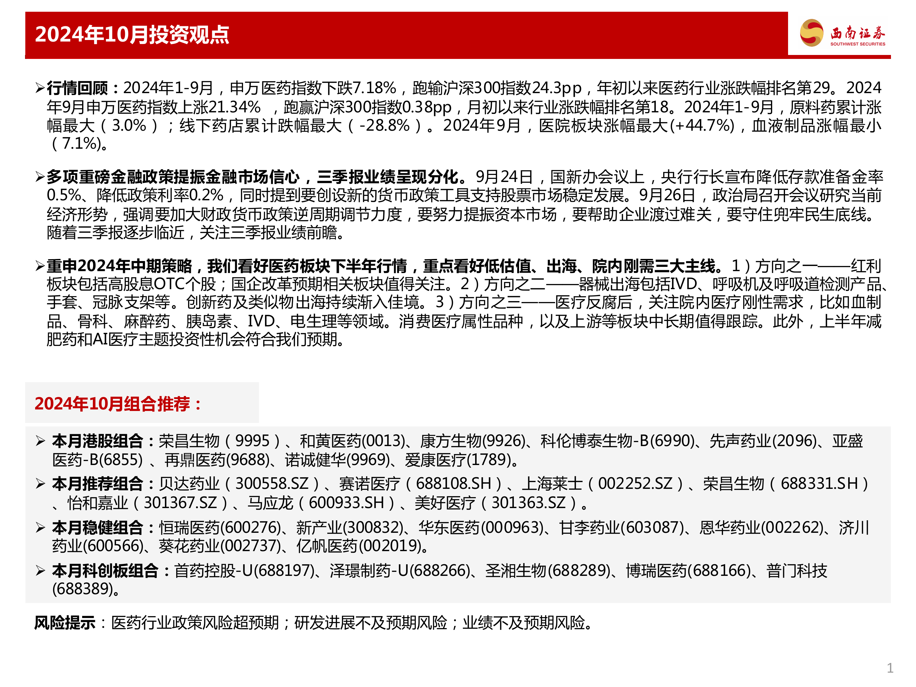 本报告的核心观点是:持续看好医药板块下半年的行情,重点关注低估值、出海、院内刚需三大主线。 报告回顾了2024年1-9月医药板块的表现,分析了9月份的行情,并结合多项重磅金融政策,对医药板块的未来发展持乐观态度。报告还对港股、A股推荐组合进行了详细分析,并提示了相关风险。