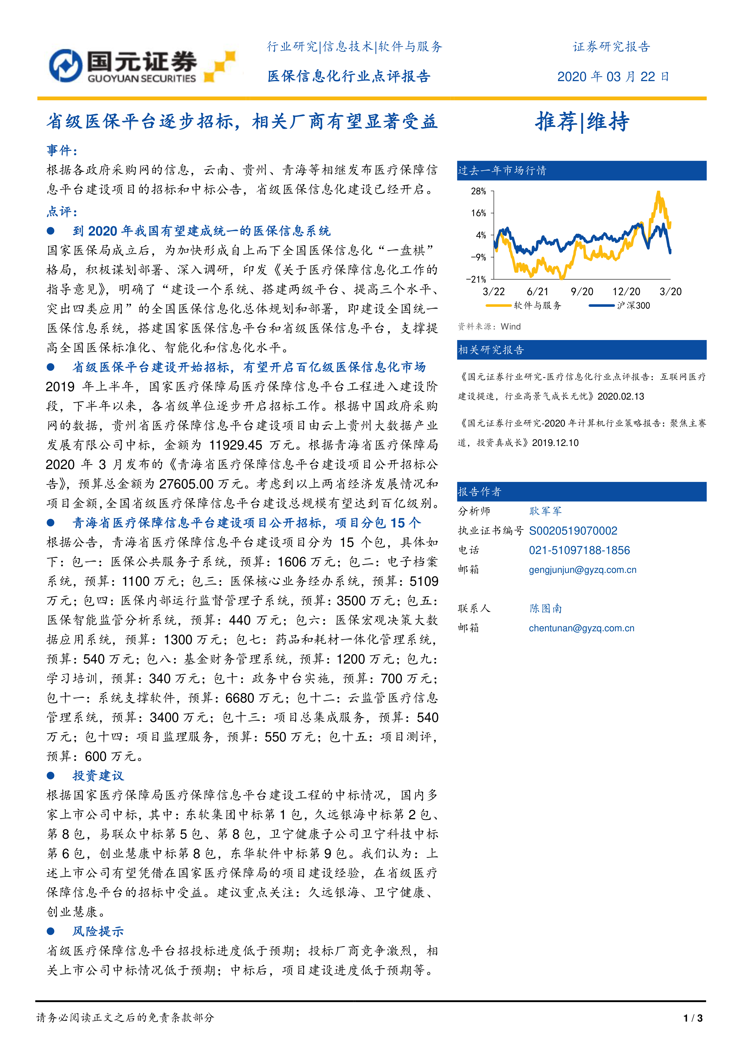 医保信息化行业点评报告:省级医保平台逐步招标,相关厂商有望显著受益