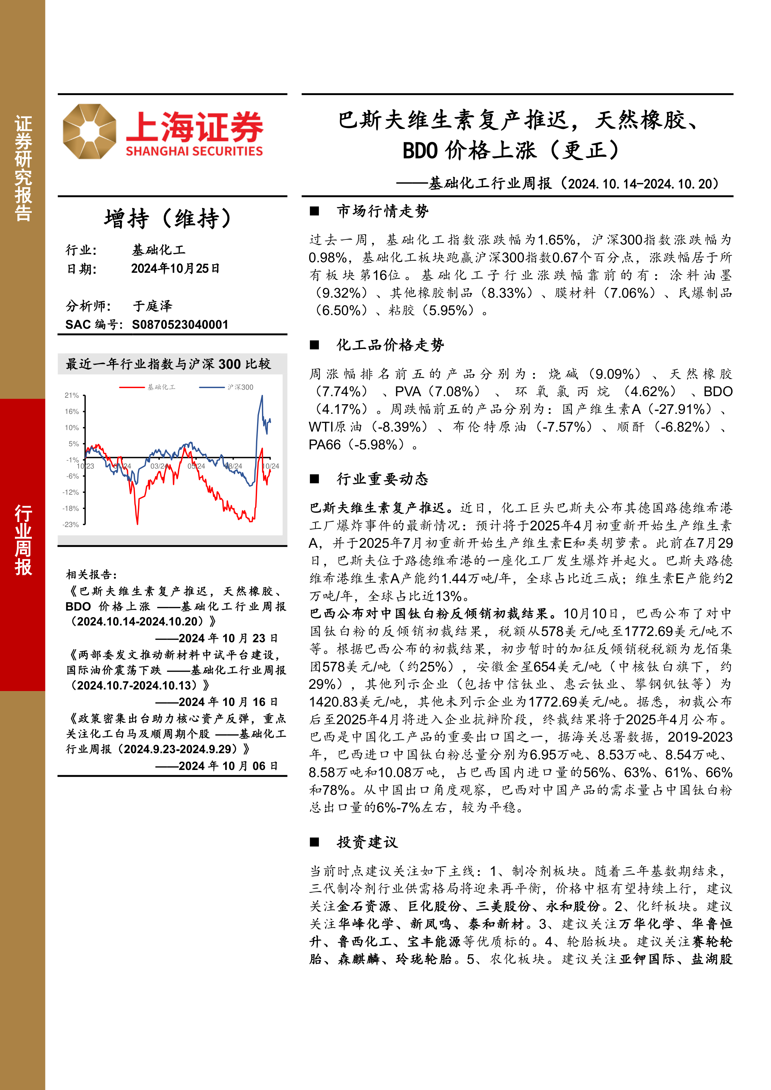 本报告分析了2024年10月14日至2024年10月20日期间基础化工行业的市场表现,重点关注了巴斯夫维生素复产推迟、天然橡胶和BDO价格上涨等事件。报告分析了行业整体走势、个股表现、化工品价格及价差变化,并对重点个股的动态进行了梳理。最后,报告给出了投资建议,建议关注制冷剂、化纤、优质化工标的、轮胎、农化及优质成长标的,并维持行业“增持”评级。