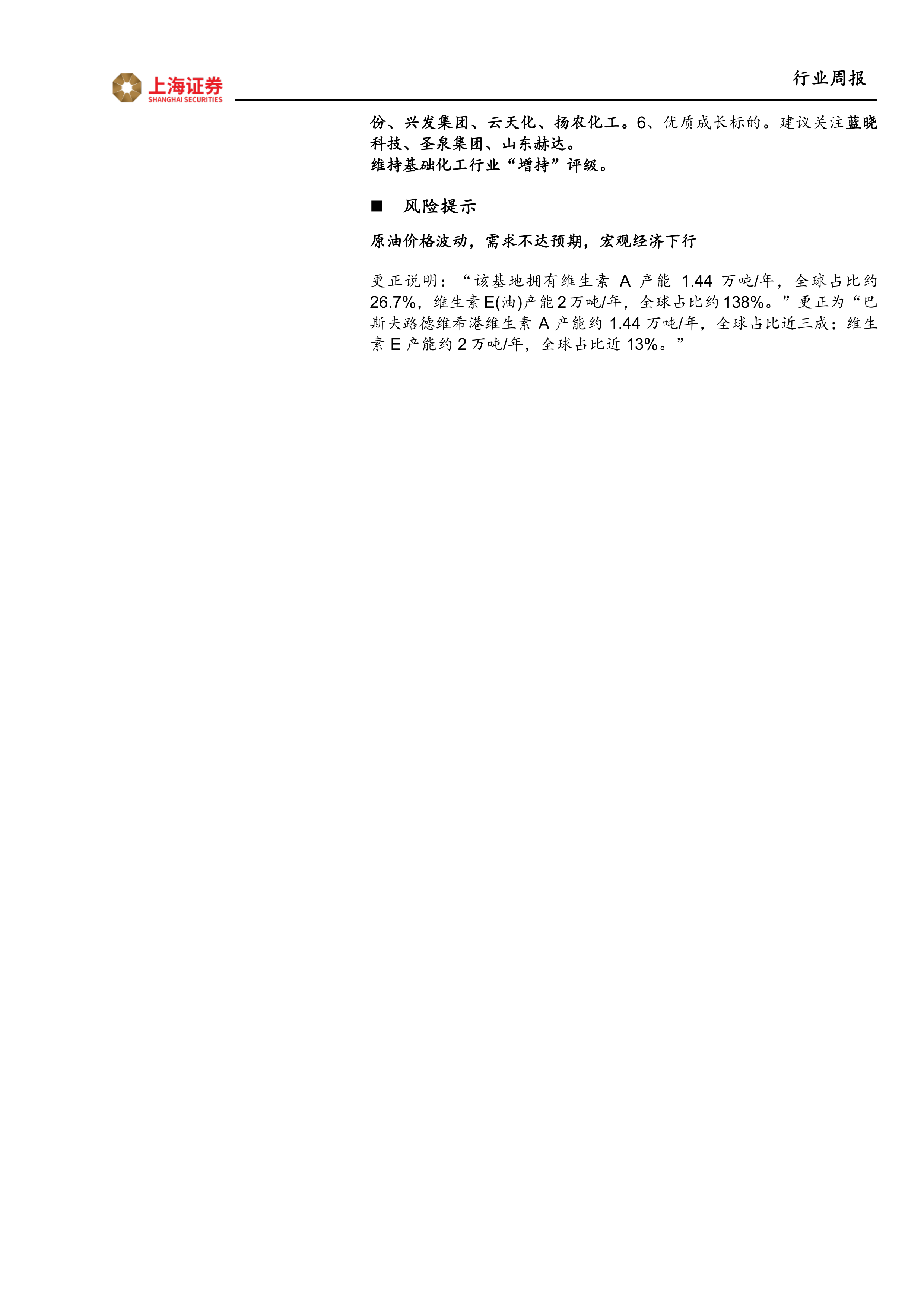 更正说明:“该基地拥有维生素A产能1.44万吨/年,全球占比约26.7%,维生素E(油)产能2万吨/年,全球占比约138%。”更正为“巴斯夫路德维希港维生素A产能约1.44万吨/年,全球占比近三成;维生素E产能约2万吨/年,全球占比近13%。”