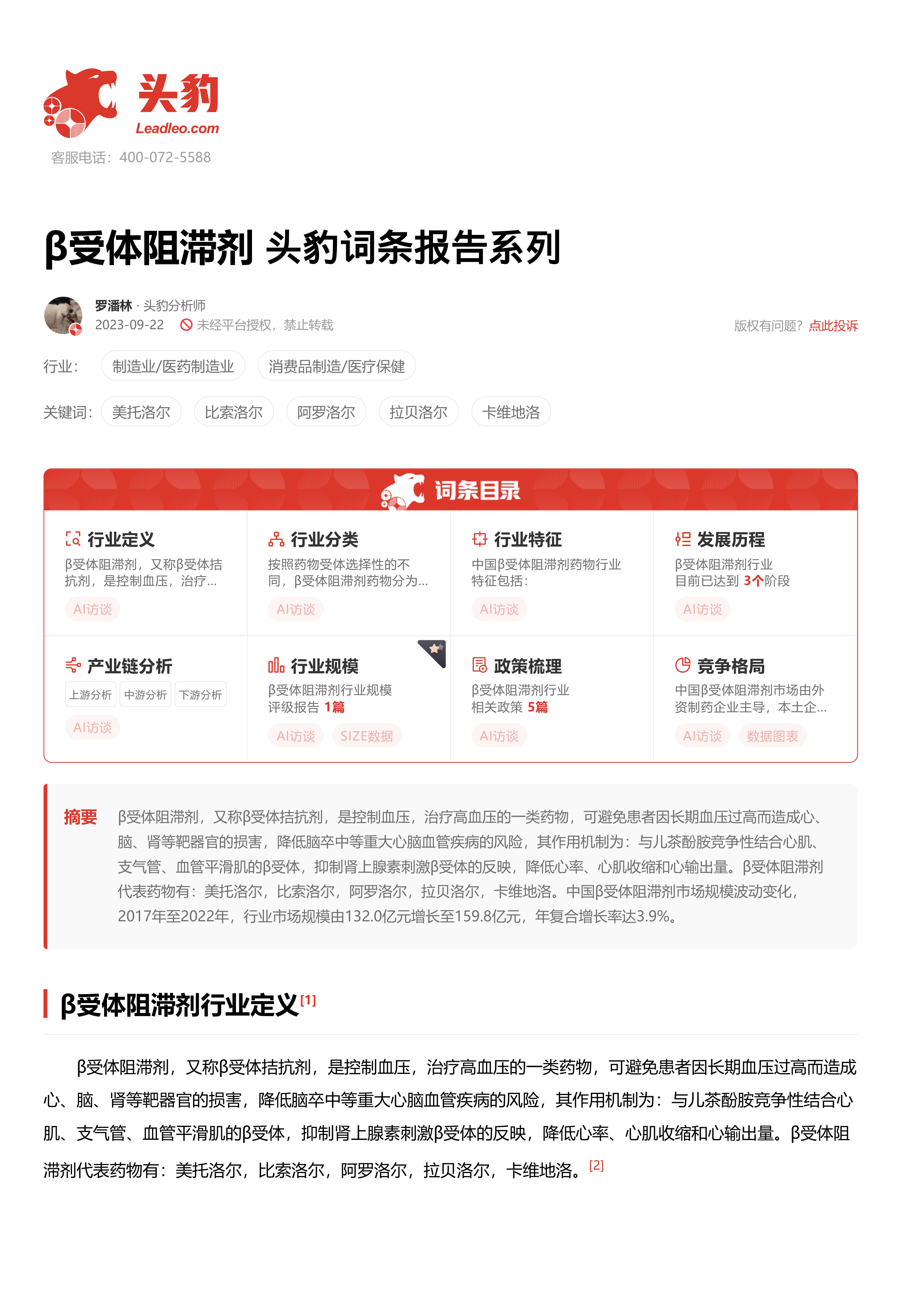 β受体阻滞剂 头豹词条报告系列