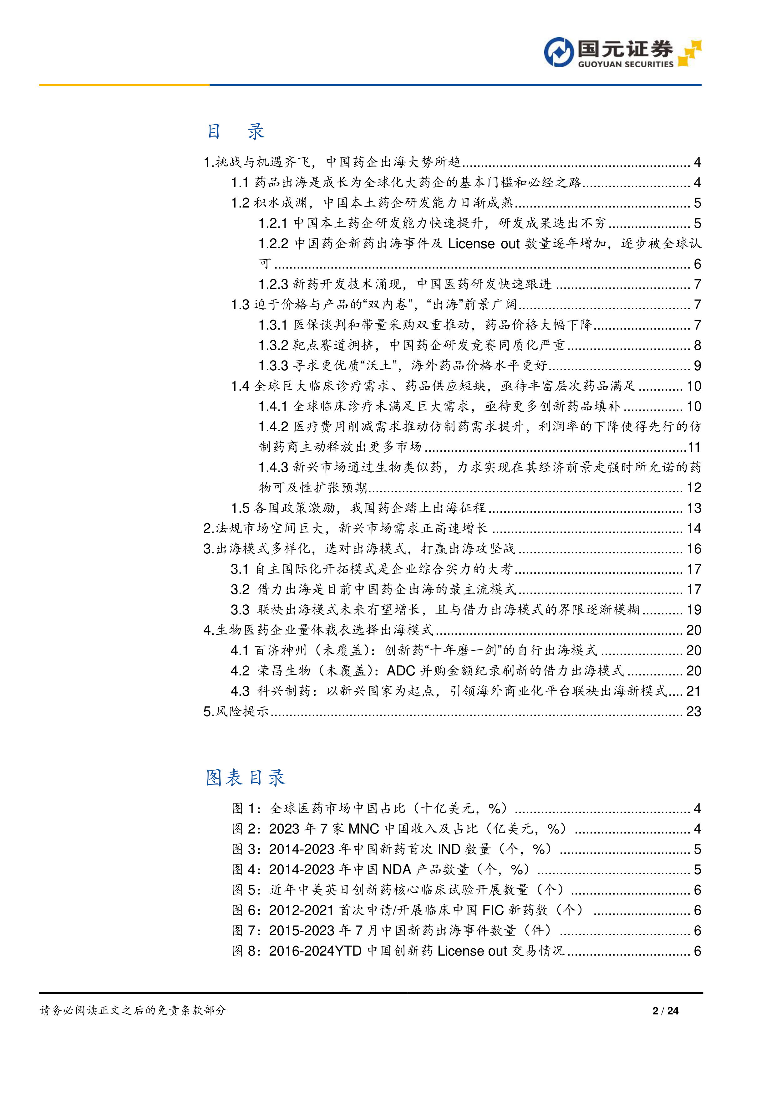 本报告深入分析了中国药企出海的背景、机遇与挑战,指出药品出海是药企实现全球化战略的关键一步。报告强调,中国药企应抓住全球市场机遇,积极拓展海外市场,并根据自身情况选择合适的出海模式。同时,报告也提示了医药行业政策风险、研发进度风险和海外商业化风险等,为药企出海提供了全面的分析和建议。