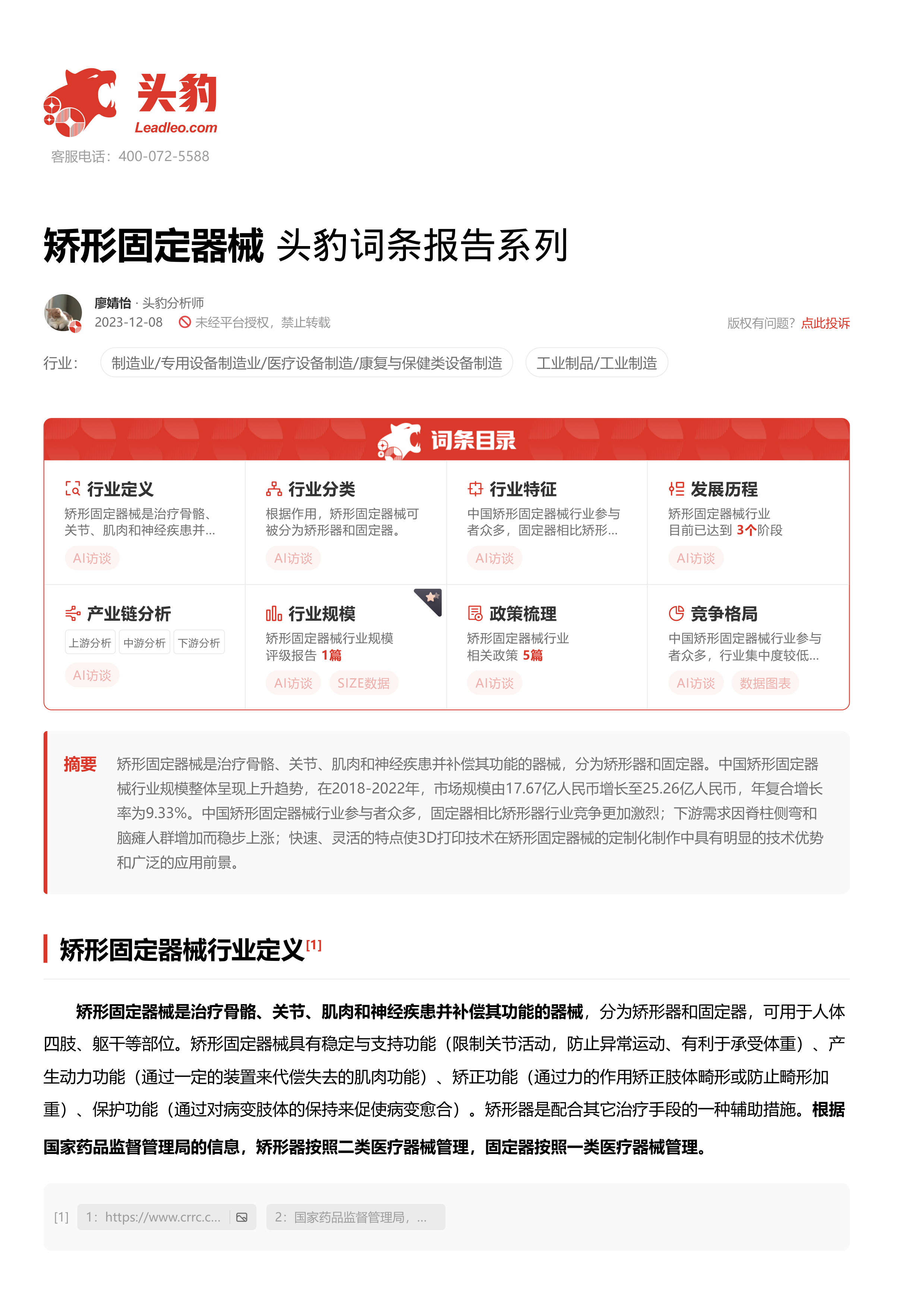 矫形固定器械 头豹词条报告系列