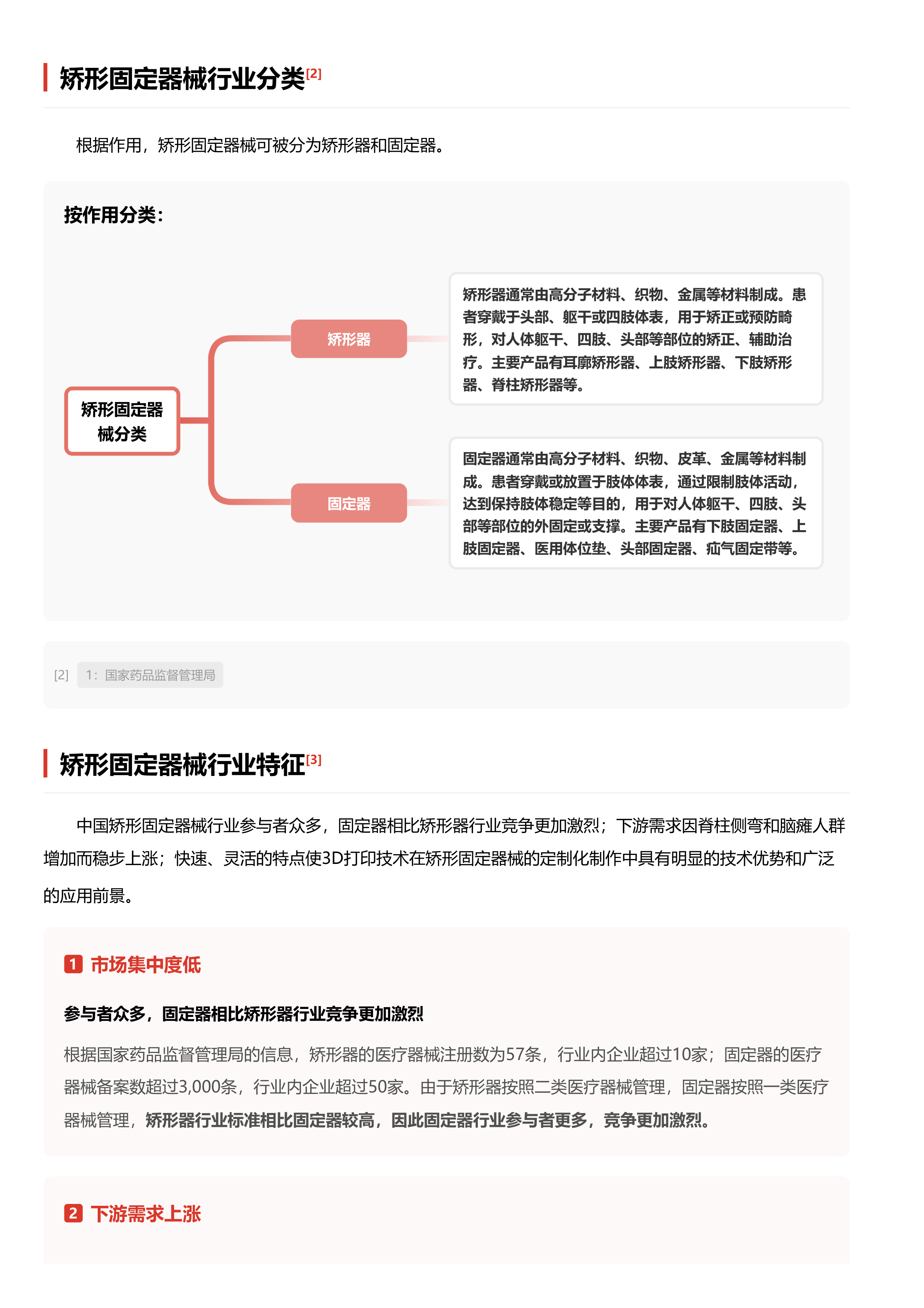 矫形固定器械是治疗骨骼、关节、肌肉和神经疾患并补偿其功能的器械,分为矫形器和固定器。中国矫形固定器械行业规模整体呈现上升趋势,在2018-2022年,市场规模由17.67亿人民币增长至25.26亿人民币,年复合增长率为9.33%。中国矫形固定器械行业参与者众多,固定器相比矫形器行业竞争更加激烈;下游需求因脊柱侧弯和脑瘫人群增加而稳步上涨;快速、灵活的特点使3D打印技术在矫形固定器械的定制化制作中具有明显的技术优势和广泛的应用前景。