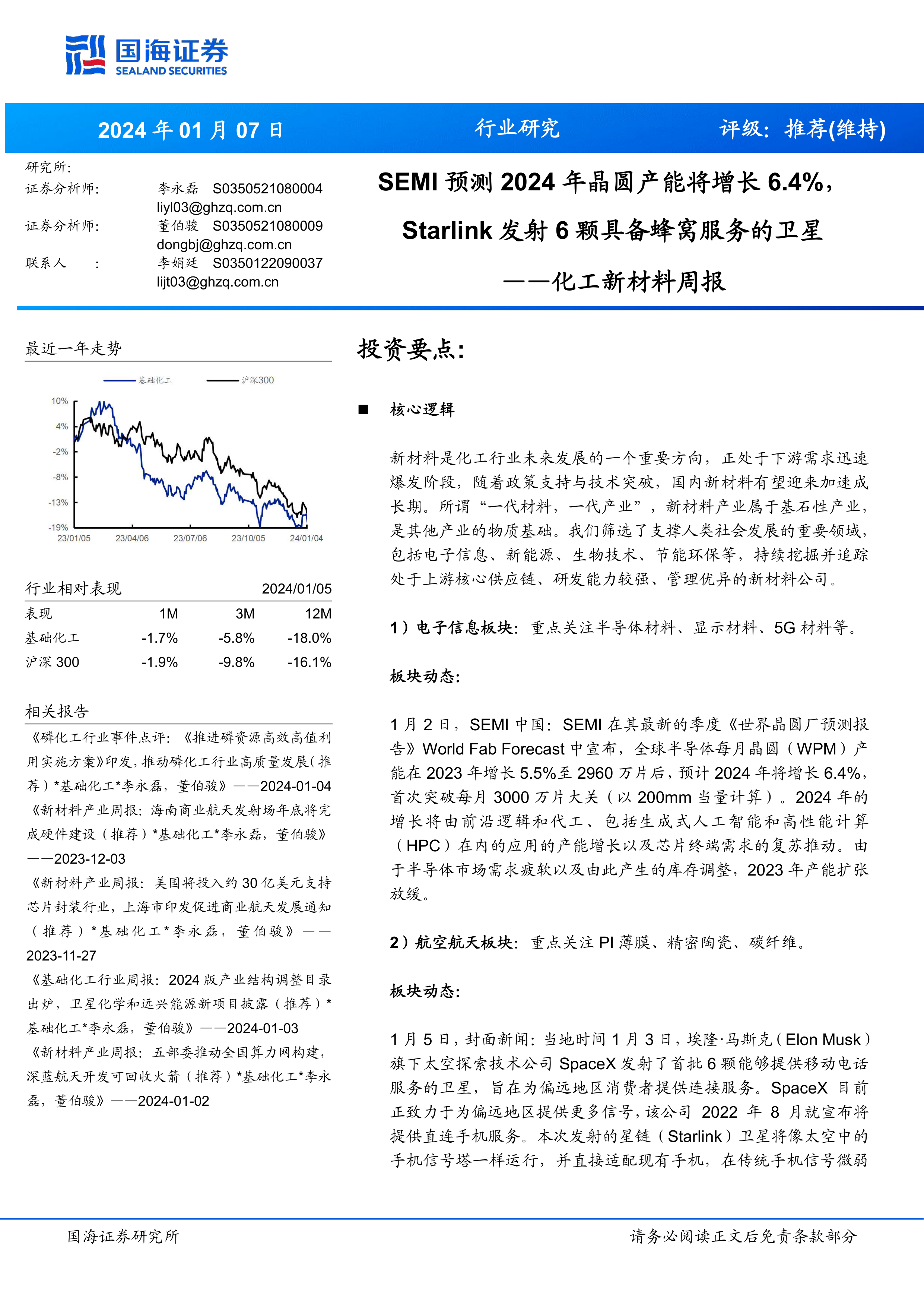 化工新材料周报:SEMI预测2024年晶圆产能将增长6.4%,Starlink发射6颗具备蜂窝服务的卫星