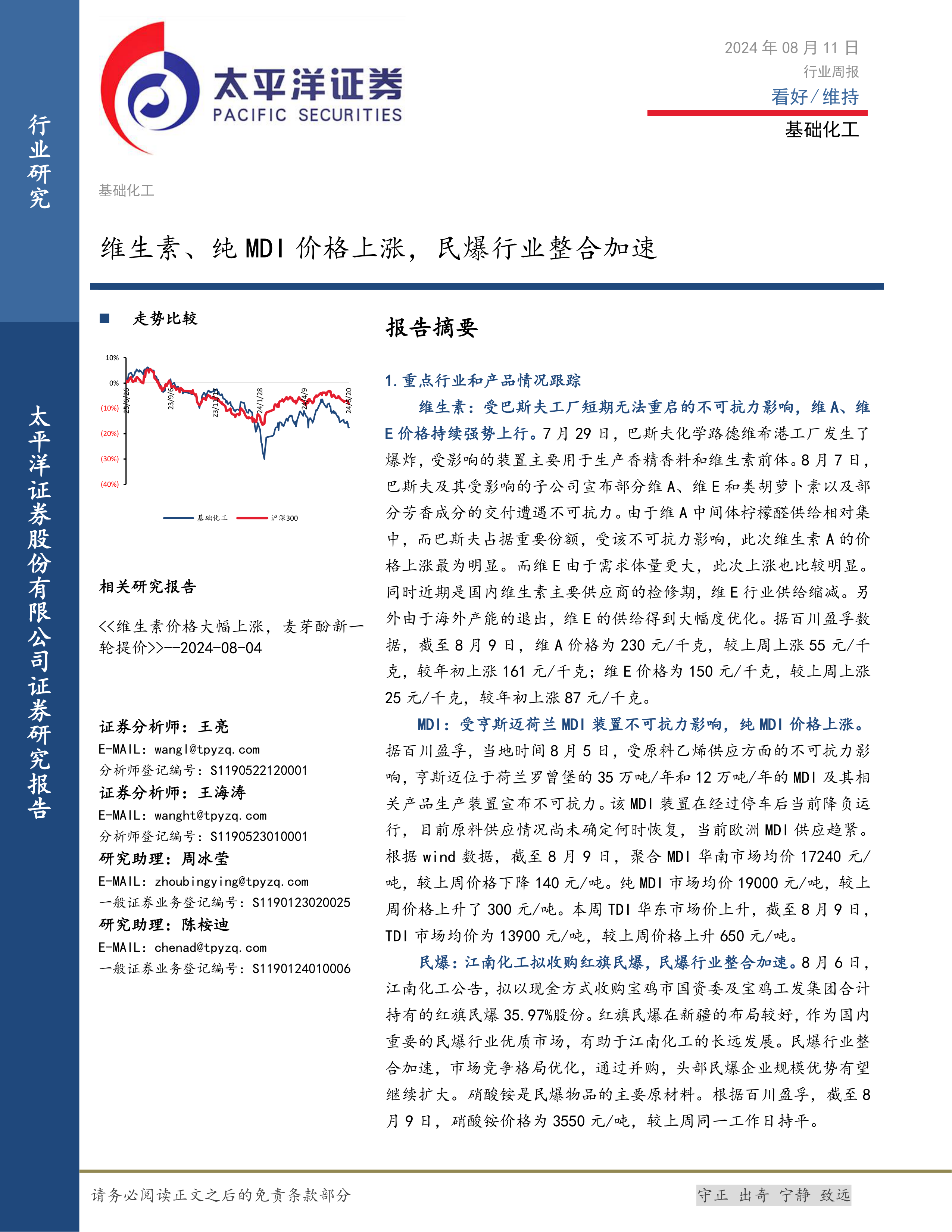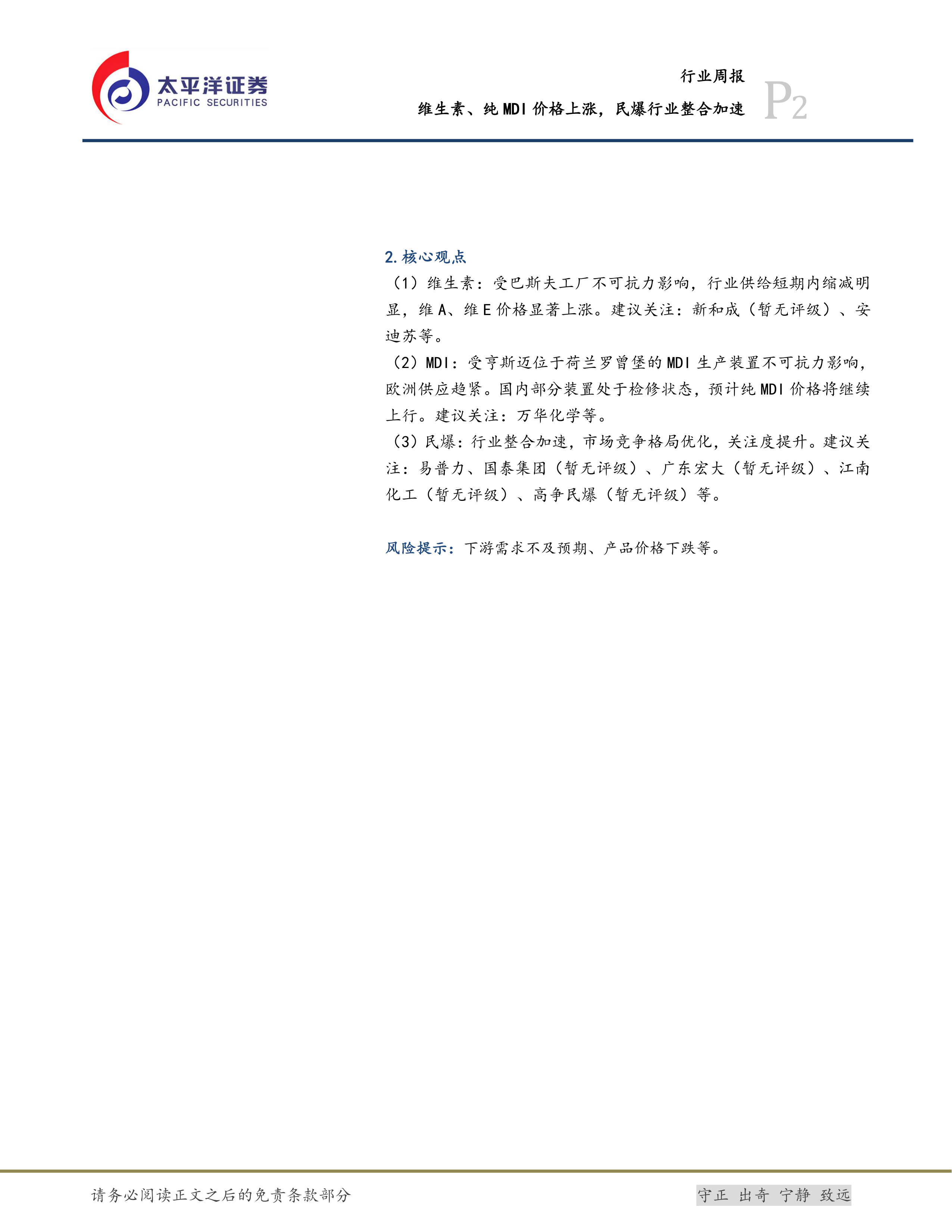 基础化工行业周报:维生素、纯MDI价格上涨,民爆行业整合加速