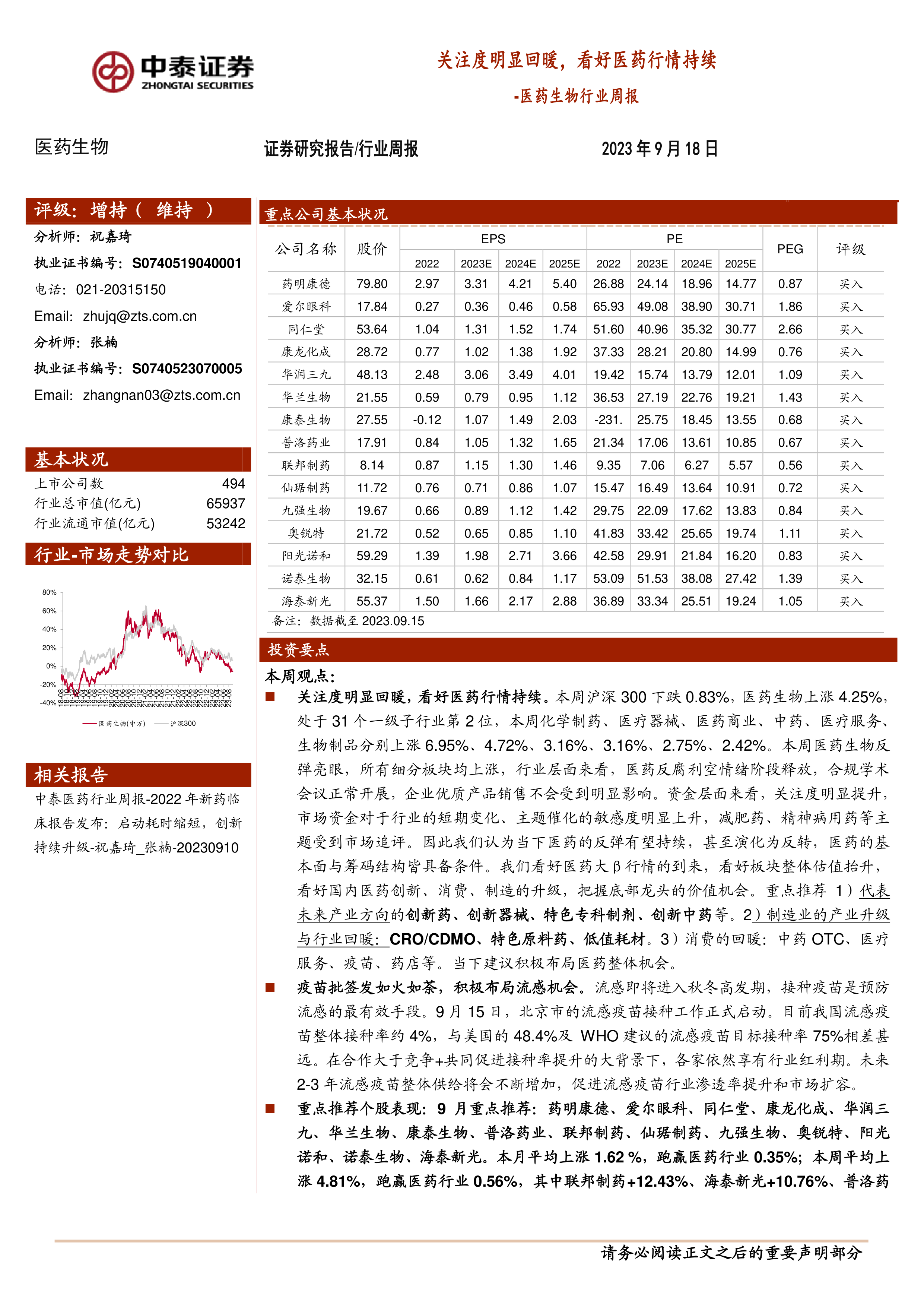 重点推荐个股表现:9 月重点推荐:药明康德、爱尔眼科、同仁堂、康龙化成、华润三九、华兰生物、康泰生物、普洛药业、联邦制药、仙琚制药、九强生物、奥锐特、阳光诺和、诺泰生物、海泰新光。本月平均上涨 1.62 %,跑赢医药行业 0.35%;本周平均上涨 4.81%,跑赢医药行业 0.56%,其中联邦制药+12.43%、海泰新光+10.76%、普洛药业+8.41%、诺泰生物+7.67%、康龙化成 6.21%、华润三九+6.04%、九强生物+5.58%、阳光诺和+4.94%等表现亮眼。